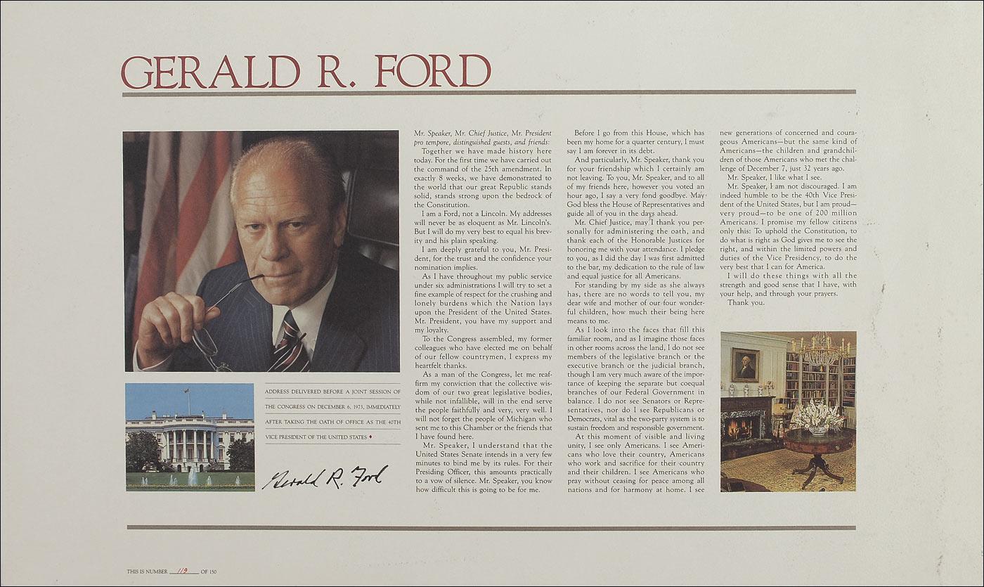 Color limited edition 21.5 x 13 lithograph containing the text of Ford’s remarks after taking the Vice President’s Oath of Office, numbered #119/150, signed in black felt tip. In fine condition. RRAuction COA.