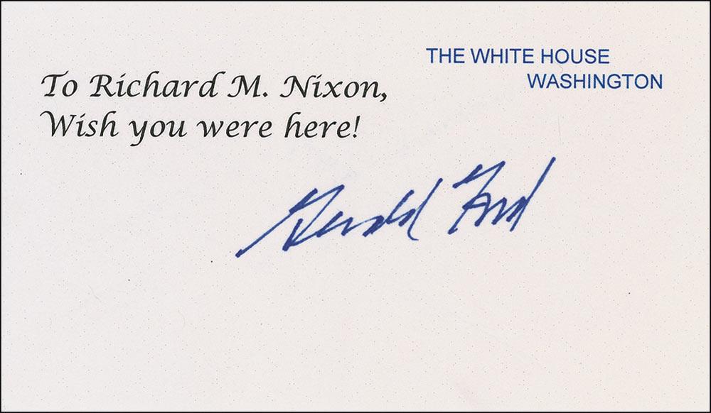 Felt tip signature, “Gerald Ford,” on a 5 x 3 mock White House card, to which was later added a printed inscription which reads, “To Richard M. Nixon, Wish you were here!” In very fine condition. RRAuction COA.
