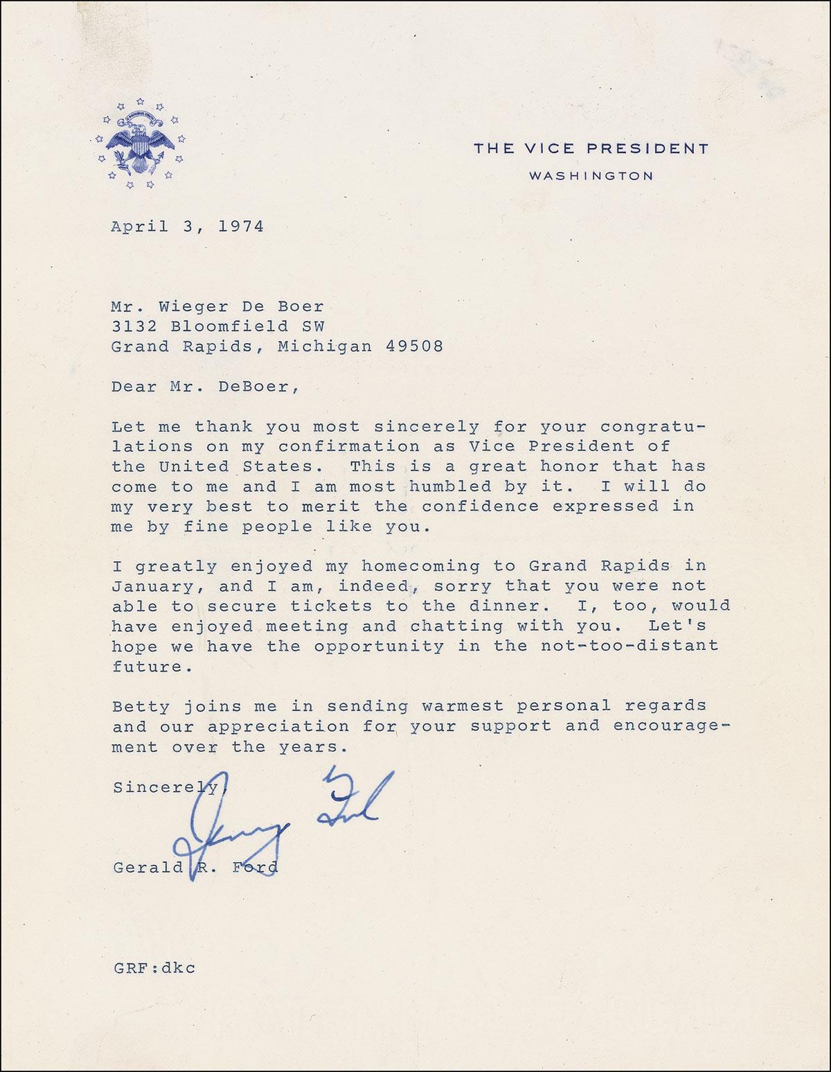 TLS signed “Jerry Ford,” one page, 7 x 9, Vice President letterhead, April 3, 1974. Letter of thanks to Mr. Wieger DeBoer. In part: “Let me thank you most sincerely for your congratulations on my confirmation as Vice President of the United States. This is a great honor that has come to me and I am most humbled by it. I will do my very best to merit the confidence expressed in me by fine people like you.” Letter is archivally sleeved in acid-free Mylar. In fine condition, with intersecting folds, and a touch of scattered light soiling. Pre-certified PSA/DNA and RRAuction COA.