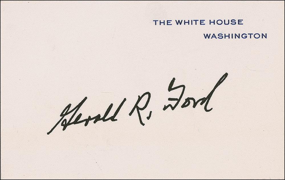 Official White House card, boldly signed in black felt tip, “Gerald R. Ford.” In very fine condition. Accompanied by a letter from Ford’s secretary. Ford is quite scarce in authentic White House cards.