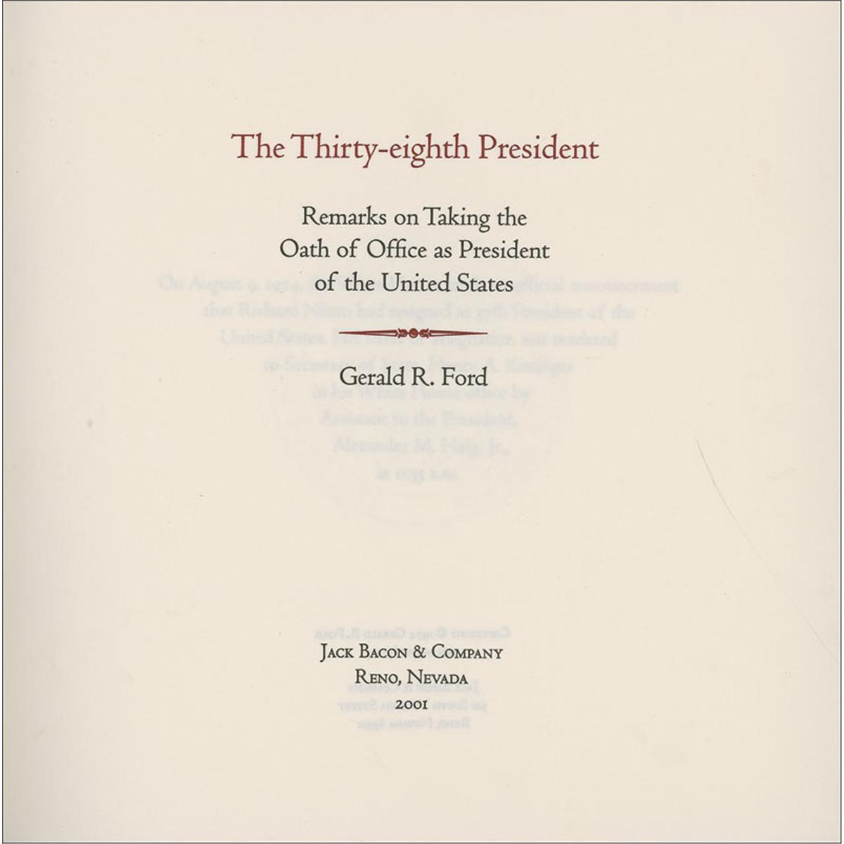 Signed book: The 38th President. Limited edition of 26 lettered copies (this copy “Q”). Reno, Nevada: Jack Bacon & Company, 2001. Hardcover with slipcase, 8.25 x 8.25. Signed in blue felt tip, “Gerald R. Ford,” on the half-title page. In very fine condition.
