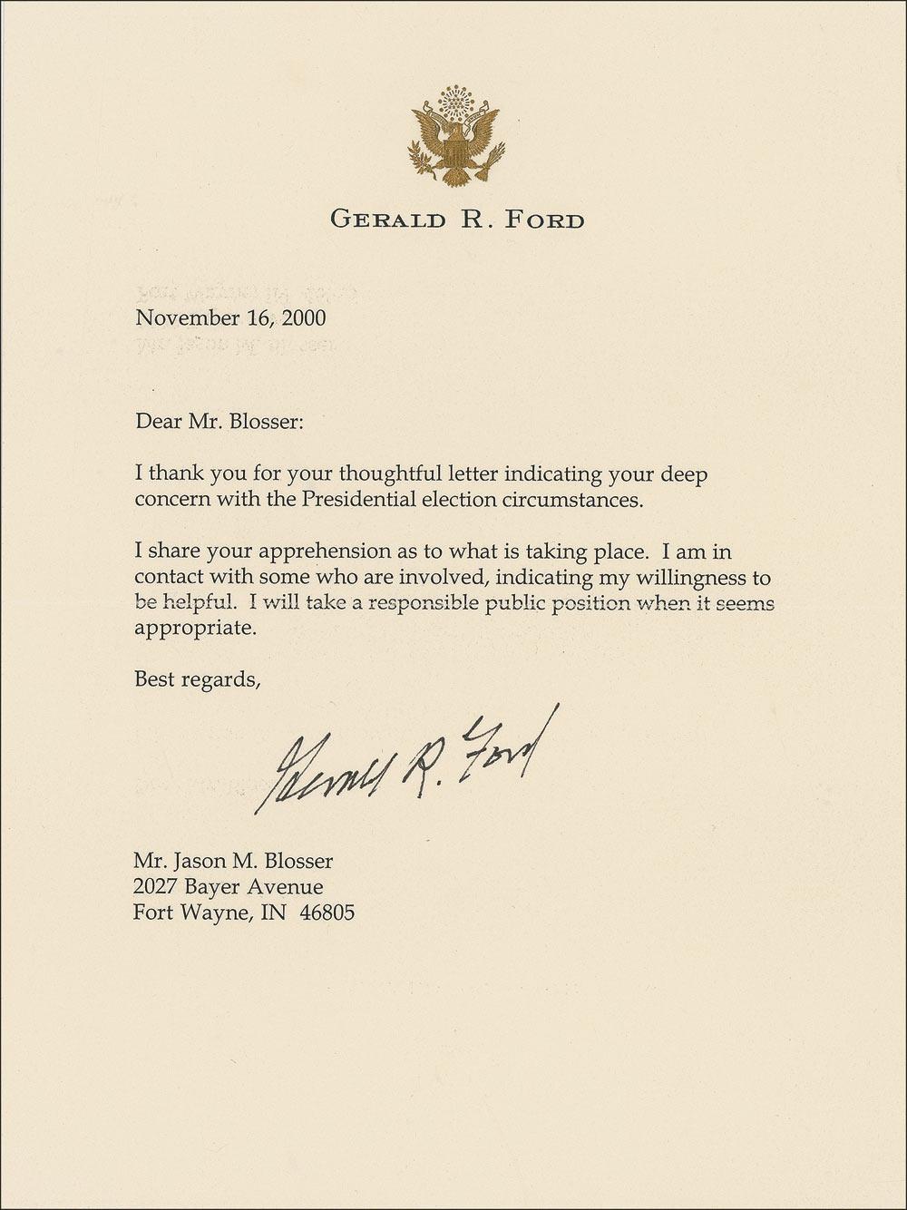 TLS signed “Gerald R. Ford,” one page, 6.5 x 8.5, personal letterhead, November 16, 2000. Response to a citizen concerning the 2000 presidential election. In full: “I thank you for your thoughtful letter indicating your deep concern with the Presidential election circumstances. I share your apprehension as to what is taking place. I am in contact with some who are involved, indicating my willingness to be helpful. I will take a responsible public position when it seems appropriate.” In very fine condition. Accompanied by the original mailing envelope. George W. Bush narrowly won the November 7 election, with 271 electoral votes to Gore's 266. The election was noteworthy for a controversy over the awarding of Florida's 25 electoral votes and the unusual event of the winning candidate having received fewer popular votes than the runner-up. It was the closest election since 1876 and only the fourth election in which the electoral vote did not reflect the popular vote. Exceptional content from a former president.
