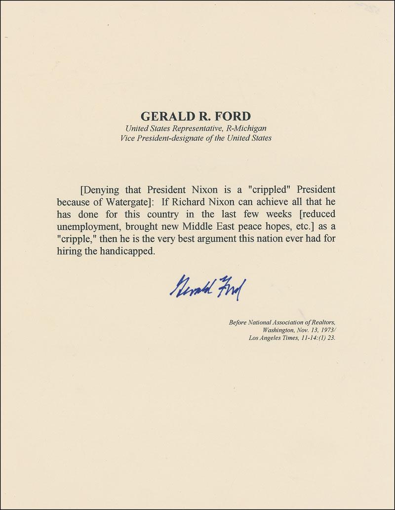 Souvenir typescript of remarks made by Ford before the National Association of Realtors on November 13, 1973, regarding Nixon’s power in light of the Watergate scandal. In part: “If Richard Nixon can achieve all that he has done for this country in the last few weeks…as a ‘cripple,’ then he is the very best argument this nation ever had for hiring the handicapped.” Signed in blue felt tip by Ford. In fine condition, with a few mild wrinkles and creases.