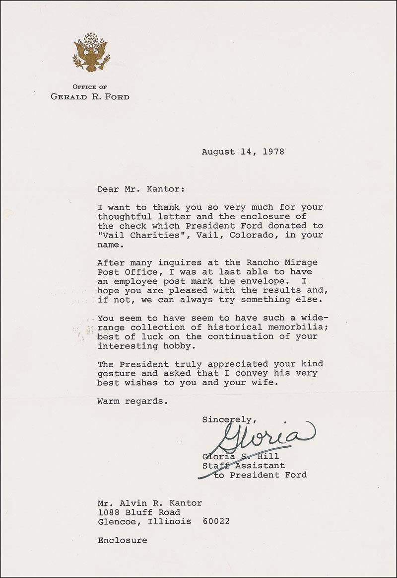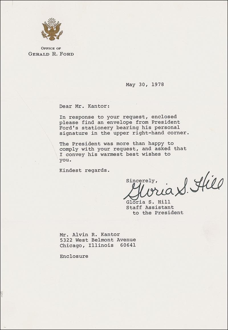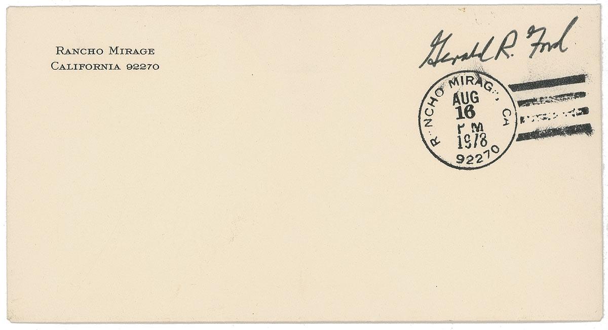 Souvenir free franked personal mailing envelope, 7.5 x 4, “franked” in the upper right corner, “Gerald R. Ford.” The unaddressed envelope bears an August 18, 1978, Ranch Mirage, California postmark as well. Accompanied by two 1978 letters from Ford’s assistant, Gloria Hill. The first one reads, in part: “Enclosed please find an envelope from President Ford’s stationery bearing his personal signature in the upper right-hand corner.” The second letter, sent a couple of months later, reads, in part: “After many inquiries at the Rancho Mirage Post Office, I was at last able to have an employee postmark the envelope.” In fine condition. As close to a Ford free frank as you may find.