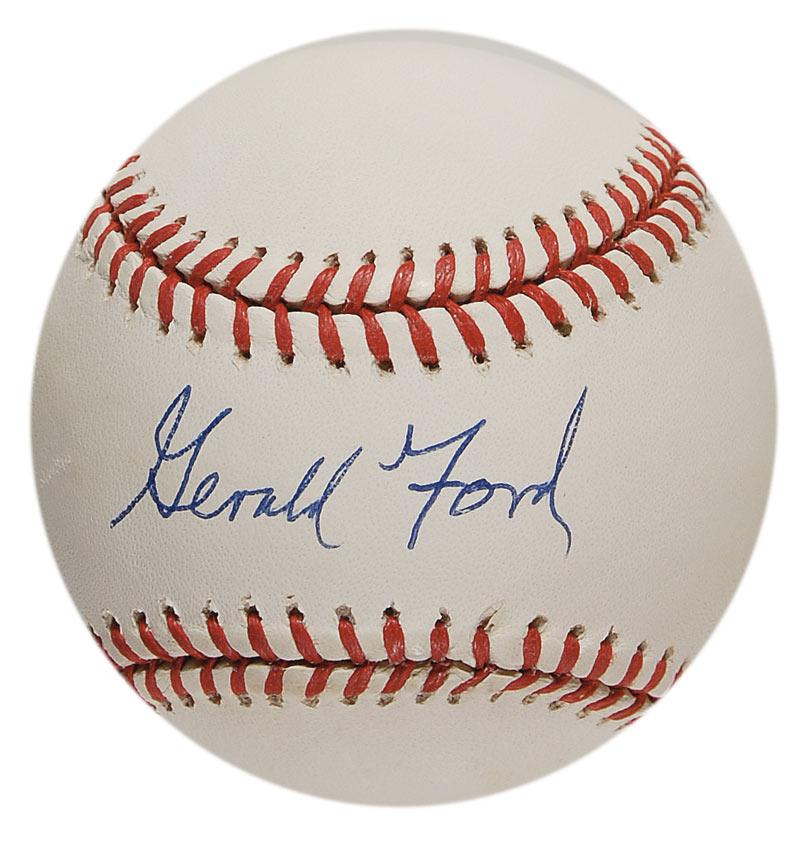 Official Rawlings American League baseball signed in blue ballpoint on the sweet spot, “Gerald Ford.” In fine condition, with some staining on the south panel.