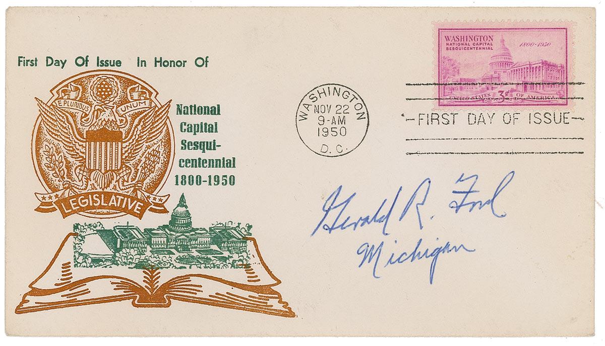 FDC with a cachet honoring 150th anniversary of the National Capital, signed signed in blue ballpoint, “Gerald R. Ford, Michigan.” In fine condition, with overall light toning.