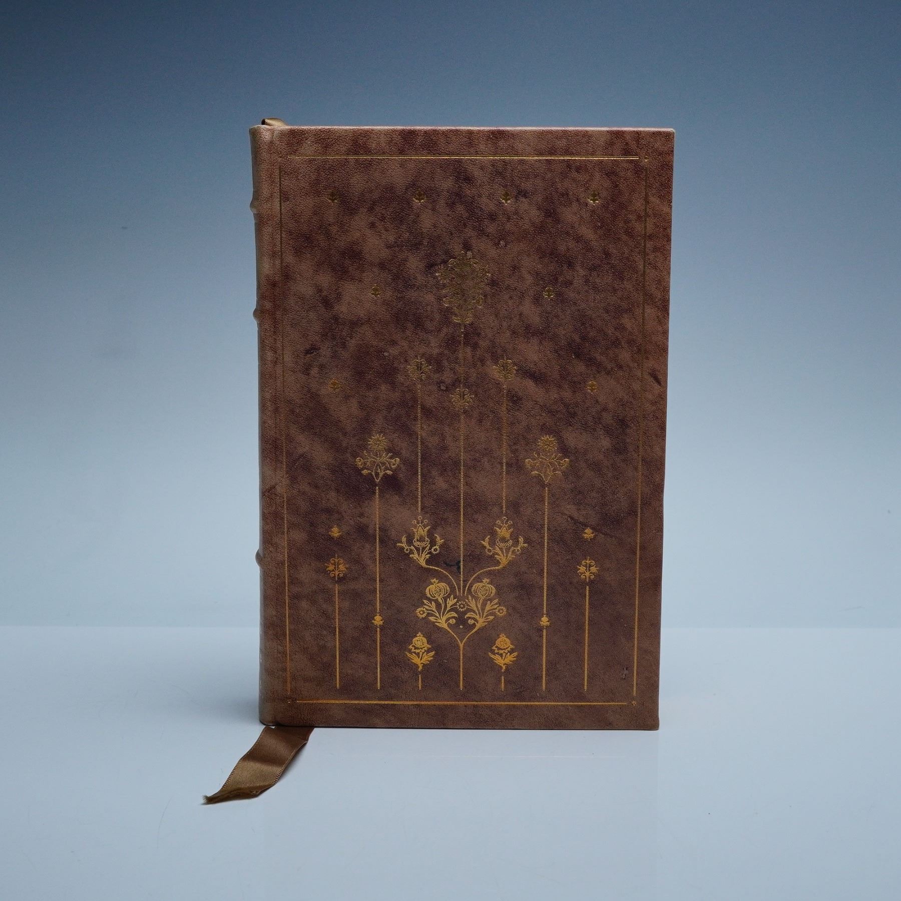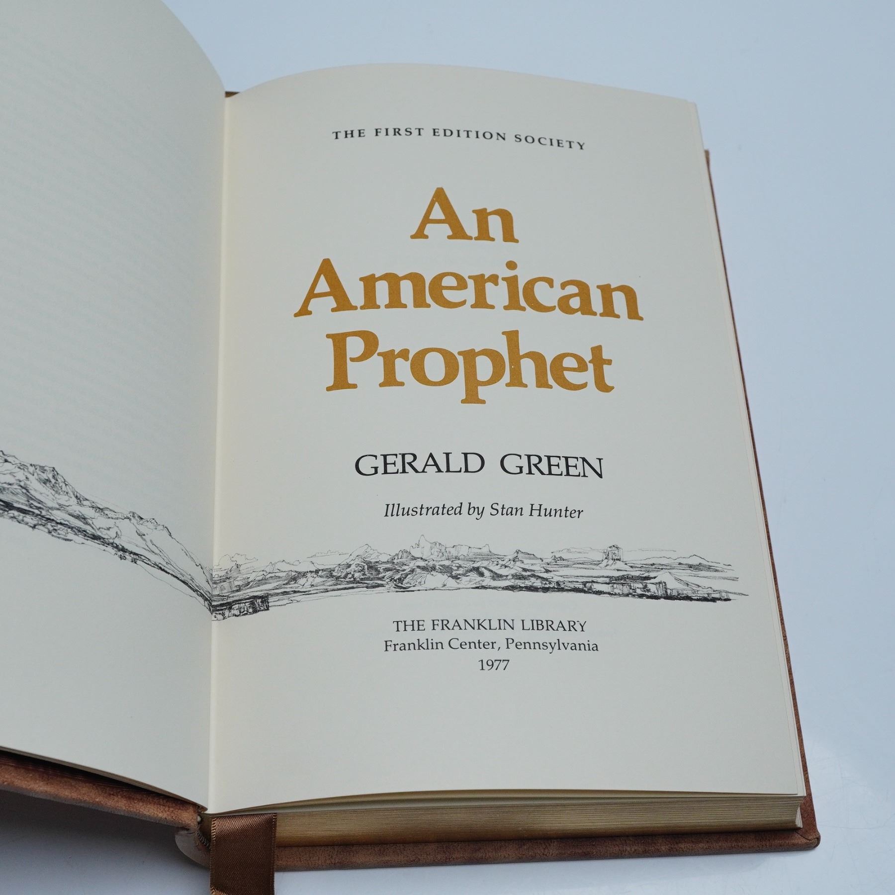 The Franklin Library First Edition Society leatherbound printing of An American Prophet by Gerald Green, illustrated by Stan Hunter and published in 1977. Bound in decorative gilt-stamped leather with gilded page edges and an attached satin ribbon bookmark, this collector's edition features archival-quality paper and detailed black-and-white illustrations. Printed in Franklin Center, Pennsylvania as part of a limited first edition series, 365 pages. Measures 6.25"L x 9"H.