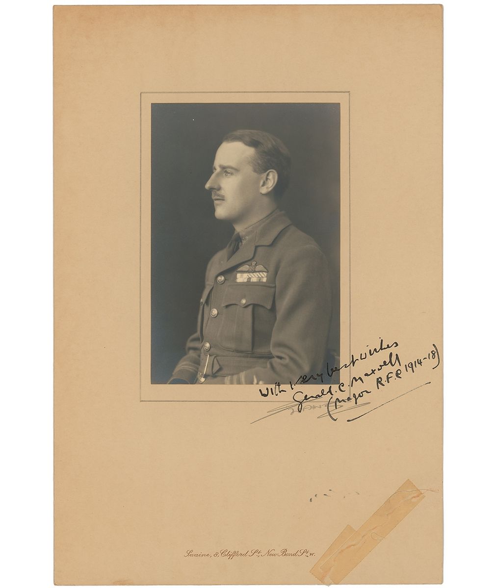 British fighter ace (1895–1959) during World War I credited with 26 victories. Matte-finish 3.75 x 5.75 photo of Maxwell in uniform, affixed to its original Swaine photographer’s mount, signed in bold black ink, “With very best wishes, Gerald C. Maxwell, (Major R. F. C. 1914–1918).” In very good to fine condition, with a tape-repaired crack to the lower right corner of the mount affecting the overall appearance. Accompanied by the Swaine studio paper folder.