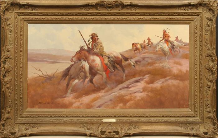 Gerald McCann (b. 1916). Return of the Raiding Party. 22" x 38" oil on board. signed and dated '77 lower left. Condition Report: Black lights clean.