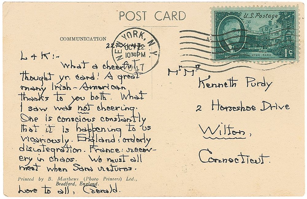 Expatriate socialite and painter (1888–1964) who, with his wife Sara, lived on the French Riviera and played a central role in the ‘Lost Generation’ social circle that included Hemingay, Fitzgerald, Dos Passos, and Picasso. ALS signed “Gerald,” one page on the reverse of a postcard depicting a painting by Pietro Longhi, 5.25 x 3.5, October 22, 1947. Letter to a friend. In part: “What I saw was not cheering. One is conscious constantly that it is happening to us vicariously. England: orderly disintegration. France: recovery in chaos. We must all meet when Sara returns.” In fine condition.