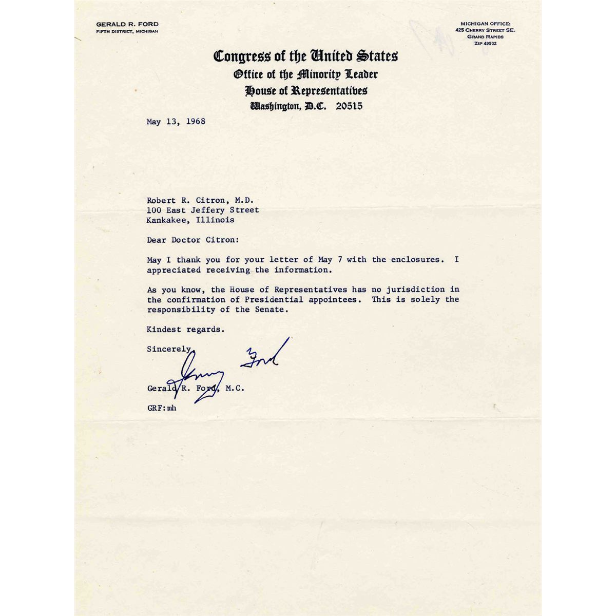 Gerald R. Ford typed letter signed. Composed as Minority Leader on Congressional letterhead and dated 13 May 1968, letter reads in part: ''...As you know, the House of Representatives has no jurisdiction in the confirmation of Presidential appointees. This is solely the responsibility of the Senate. Kindest regards, Sincerely, Jerry Ford...'' Usual letter folds, else fine.