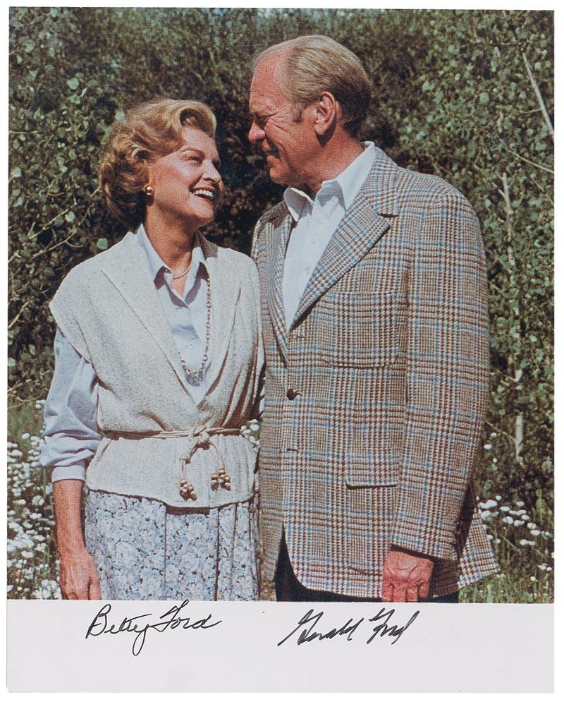 Color glossy 8 x 10 photo of the Fords posing outdoors, signed in the lower border in black felt tip by Gerald and Betty Ford. In fine condition.