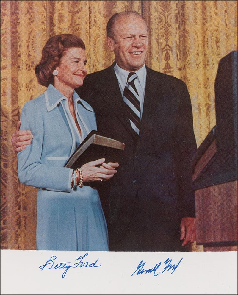 Color glossy 8 x 10 photo of the Fords after his inauguration as president, signed in the lower border in blue felt tip by Gerald and Betty Ford. In fine condition.