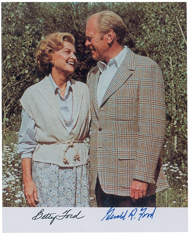 Color glossy 8 x 10 photo of the Fords outdoors, signed in the lower border in blue felt tip, “Gerald R. Ford,” and in black felt tip, “Betty Ford.” In fine condition, with a few trivial surface dings.