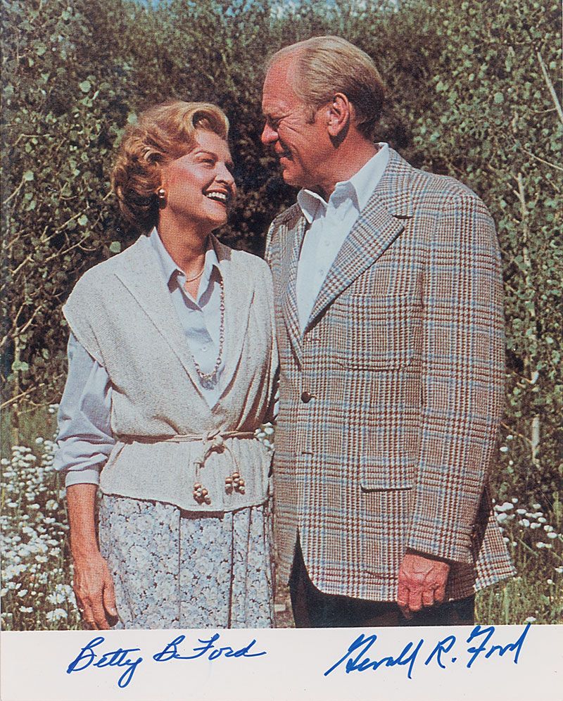 Color glossy 8 x 10 photo of the Fords posing together outside, signed in the lower border in blue felt tip, “Betty Ford” and “Gerald R. Ford.” In fine condition.