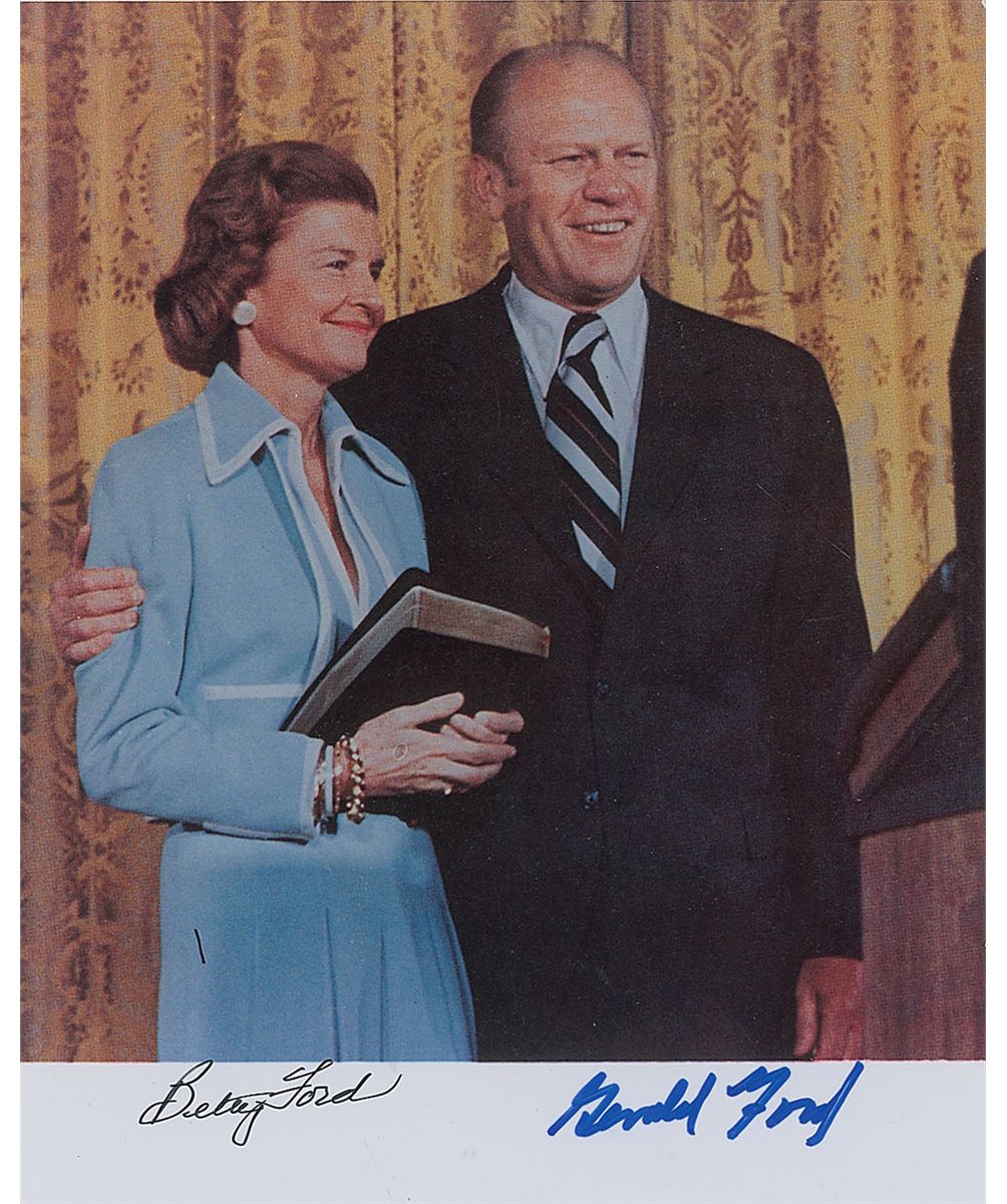Color glossy 8 x 10 photo of the Fords shortly after his inauguration, signed in the lower border in blue felt tip by Gerald Ford and in black felt tip by Betty Ford. In fine condition.