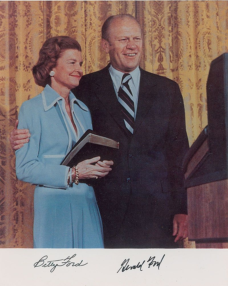 Color glossy 8 x 10 photo of the Fords posing together shortly after his inauguration, signed in the lower border in black felt tip by Gerald and Betty Ford. In very fine condition.