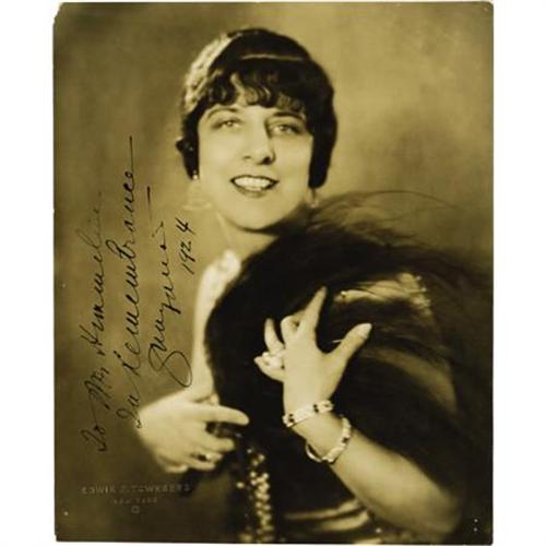 <B>Geraldine Farrar Signed Photo.</B></I> A b&w 7.5" x 9.5" promo photo of the opera singer and film star, inscribed, dated 1924, and signed by her in black fountain ink. In Fine to Very Fine condition.<BR><BR><b>Shipping:</b> Flat Material, Small (<a target="_blank" href="http://www.heritageauctions.com/common/shipping.php">view shipping information</a>)