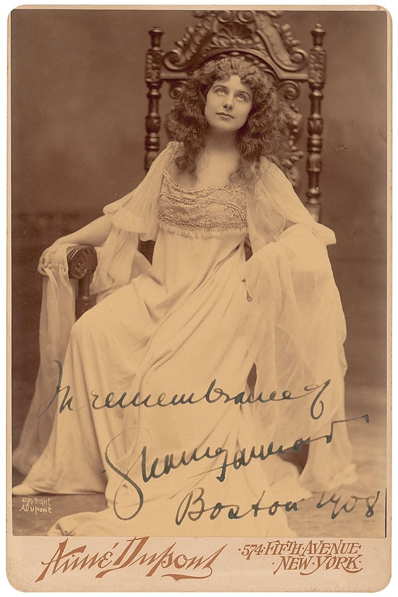 Original 4.25 x 6.5 cabinet photo of Farrar seated in an ornate chair, signed in black ink, “In remembrance of Geraldine Farrar, Boston 1908.” Published by Aime Dupont of New York. In fine condition.