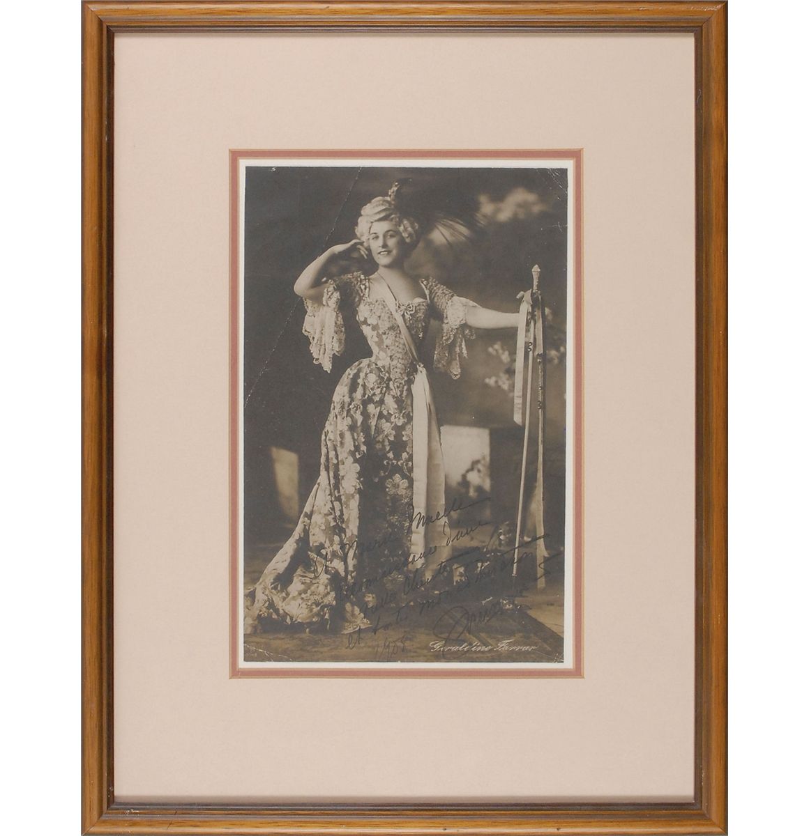 Vintage matte-finish 7 x 11 full-length photo of Farrar in a powdered wig and gown, inscribed in fountain pen, in French, and signed, “Geraldine Farrar 1908.” Double-matted and framed to an overall size of 14.25 x 18.5. In very good condition, with trimmed edges, and light creasing to three corner tips, with a more noticeable diagonal crease to top left.