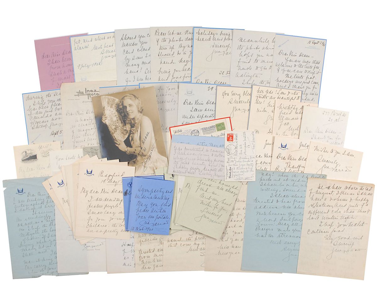 American operatic soprano and silent film star (1882–1967) who was one of the most popular musical artists of her day, and whose style and presence inspired scores of imitative female fans dubbed ‘Gerryflappers.’ Large collection of 52 items consisting of 49 ALSs, many multi-page, dating from the 1920s and ’30s, all to Marion Deane, one TLS, dated September 1, 1946; a vintage matte-finish 6.5 x 9 portrait of Farrar, signed and inscribed in fountain pen and dated 1931; and a pre-printed Christmas card with a brief unsigned note by Farrar along the bottom. In overall fine condition.