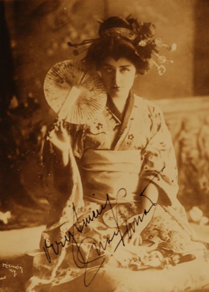 Geraldine Farrar (February 28, 1882 – March 11, 1967) was an American soprano opera singer and film actress, noted for her beauty, acting ability, and "the intimate timbre of her voice." She had a large following among young women, who were nicknamed "Gerry-flappers".Fanstaic signed vintage photo from the role she is most remembered for in Madama Butterfly by Puccini.