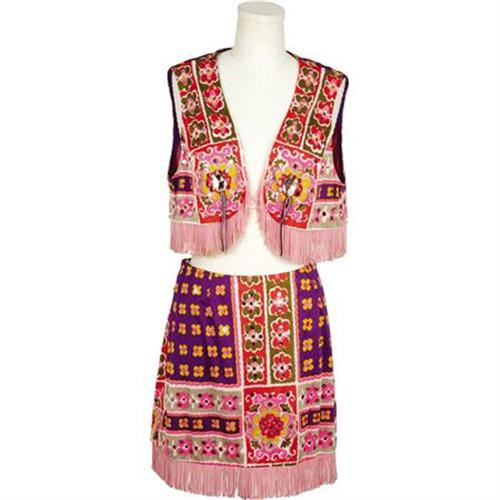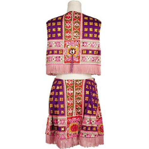 <B>Flip Wilson Screen-Worn "Geraldine" Costumes.</B></I> Geraldine's psychedelic, two-piece purple, pink, and yellow ensemble featuring a floral pattern, large pink stones with purple suede detailing and pink fringe along the hem of the top and mini skirt. Also, a completely padded bra with feminine pink lace trim, both worn by television's first African-American super star, Flip Wilson on <I>The Flip Wilson Show</B></I> (1970-74). Designed by and acquired from Mr. Bill Belew, who at about the same time was creating Elvis Presley's trademark jumpsuits. <I>Authenticated by the world's foremost curators of television artifacts, The Comisar Collection of Beverly Hills.</B></I><BR><BR><b>Shipping:</b> Clothing, Costumes & Jerseys (<a target="_blank" href="http://www.heritageauctions.com/common/shipping.php">view shipping information</a>)