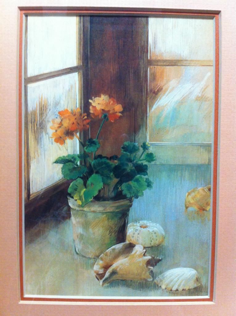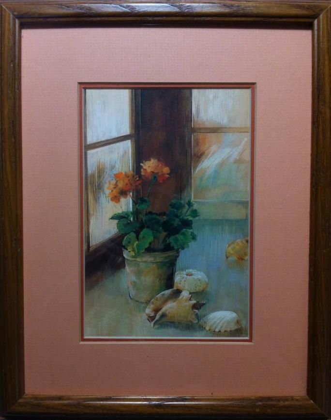 Frame Size: 10 1/2" x 13" Image size: 5" x 8" This unsigned watercolor is of a geranium potted plant catching the morning light coming through the window.