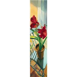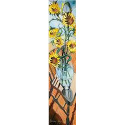 Gerard Byrne (b.1958) SUNFLOWERS and POTTED PLANTS (A PAIR) each work signed and dated [1998] lower left oil on canvas 152 by 36cm., 60 by 14in. each Exhibited: ‘Gerard Byrne’, Gorry Gallery, Dublin, 8-21 October 1998, catalogue no.s 43 and 45 respectively (the former illustrated on inside front cover of the catalogue) Born in Dublin, Gerard Byrne is a self taught artist who has been exhibiting regularly since 1989. His subject matter mainly focuses on his native city, painting vibrant street scenes while also exploring the Botanic Gardens where he has produced many of his flower study paintings. Since he often works plein air, his choice of canvas has changed in recent years to favour tall narrow proportions that are easier to handle.