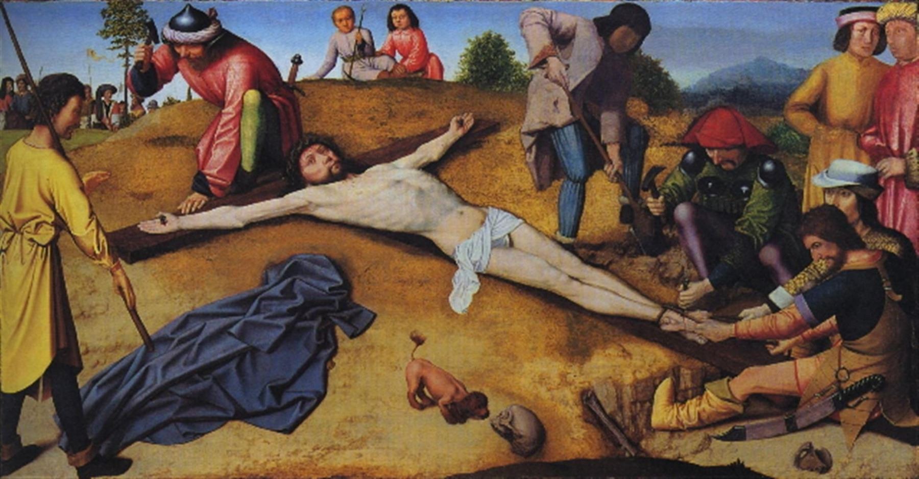 Artist: Gerard David - Title: Christ Nailed to the Cross - Medium: Fine Art Giclee on Canvas - Image Size: Approximately 20 inches x 10.5 inches - Unframed on Unstretched Canvas - Biography: Gerard David (c. 1460 - 13 August 1523) was an Early Netherlandish painter and manuscript illuminator known for his brilliant use of color. Only a bare outline of his life survives, although some facts are known. He may have been the Meester gheraet van brugghe who became a master of the Antwerp guild in 1515. He was very successful in his lifetime and probably ran two workshops, in Antwerp and Bruges.Like many painters of his period, his reputation diminished in the 17th century until he was rediscovered in the 19th century.
