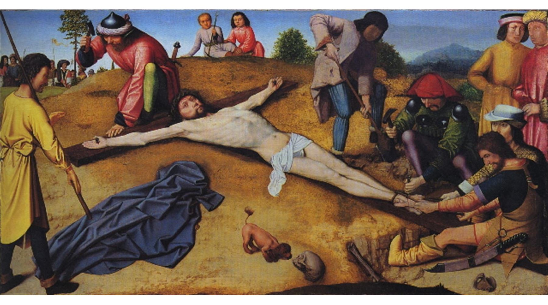 Artist: Gerard David - Title: Christ Nailed to the Cross - Medium: Fine Art Giclee on Canvas - Image Size: Approximately 32 inches x 16.5 inches - Unframed on Unstretched Canvas - Biography: Gerard David (c. 1460 - 13 August 1523) was an Early Netherlandish painter and manuscript illuminator known for his brilliant use of color. Only a bare outline of his life survives, although some facts are known. He may have been the Meester gheraet van brugghe who became a master of the Antwerp guild in 1515. He was very successful in his lifetime and probably ran two workshops, in Antwerp and Bruges.Like many painters of his period, his reputation diminished in the 17th century until he was rediscovered in the 19th century.
