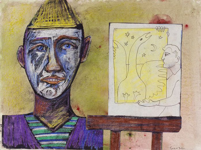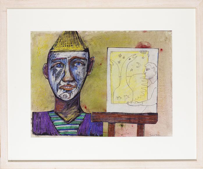 pen and ink with gouache and pastel and collage element on papersigned lower right; with inscribed Taylor Galleries label on reverse