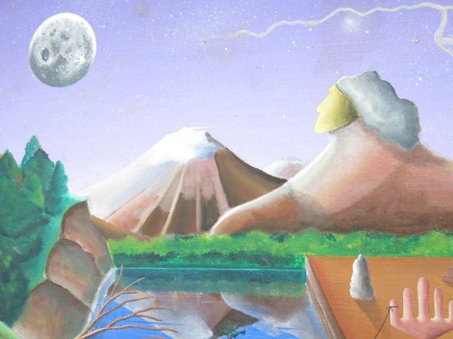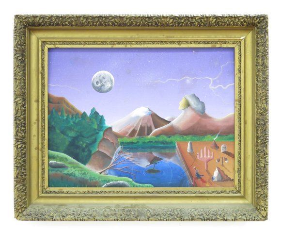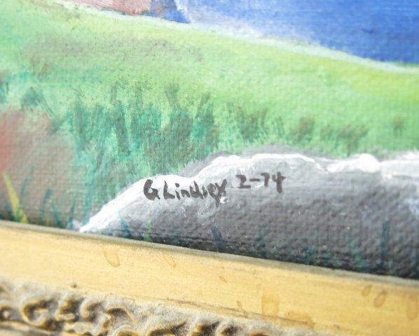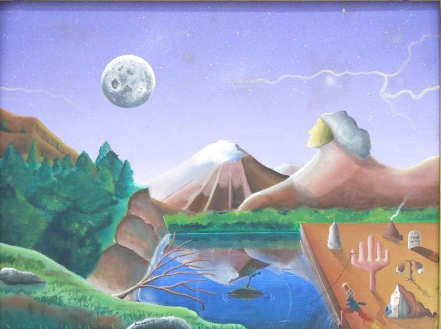Oil on board. Framed. Signed & dated bottom 1974. Gerard Lindsey, Surrealist. Approx. 16" H x 20" W unframed, 20" H x 24" W framed.