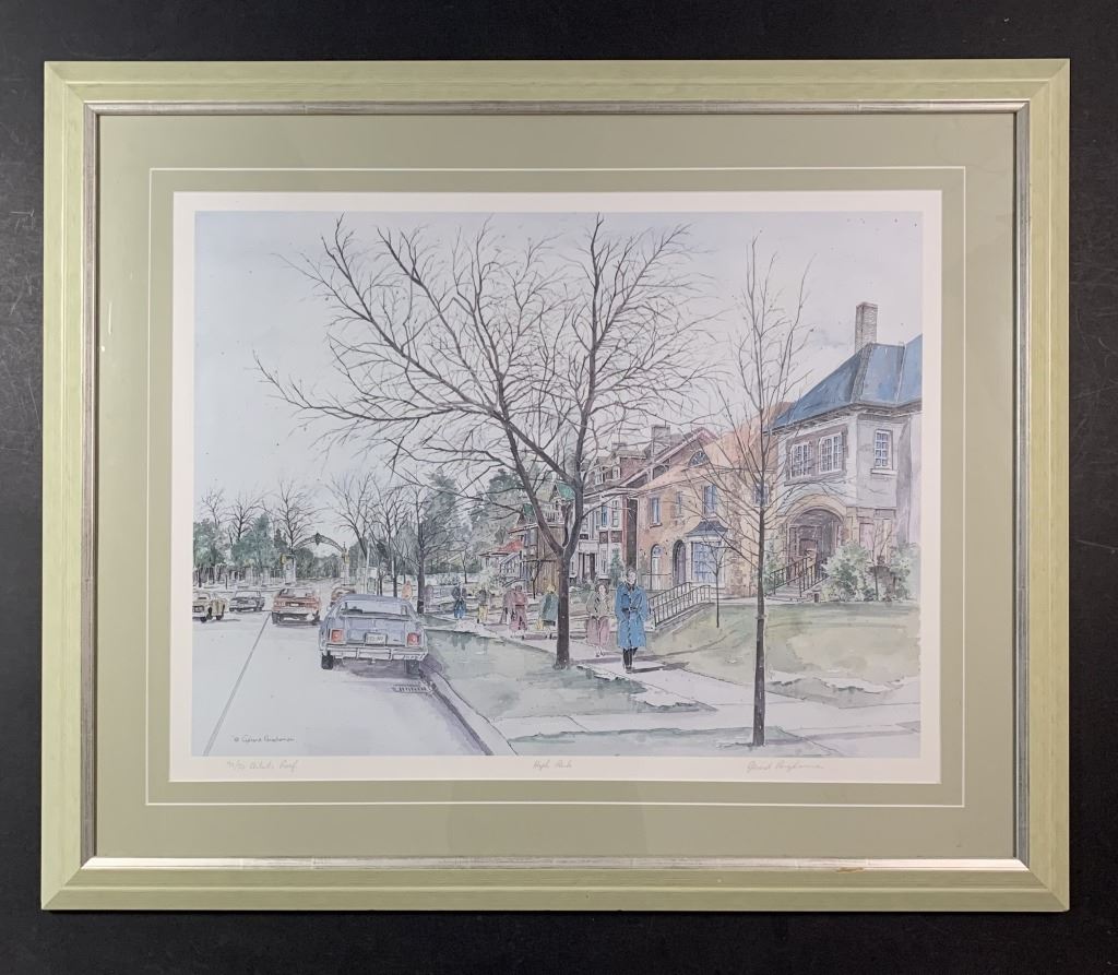 Gerard Paraghamian's "High Park" limited edition print, signed lower right, titled lower middle, and numbered 32/50 Artist Proof lower left. This piece is of a bustling street with homes at the side, and people walking on the sideway, in the community of High Park in Toronto, Ontario, Canada. This piece is in excellent condition, and has been professionally matted with acid free matting, and has been custom framed under glass.