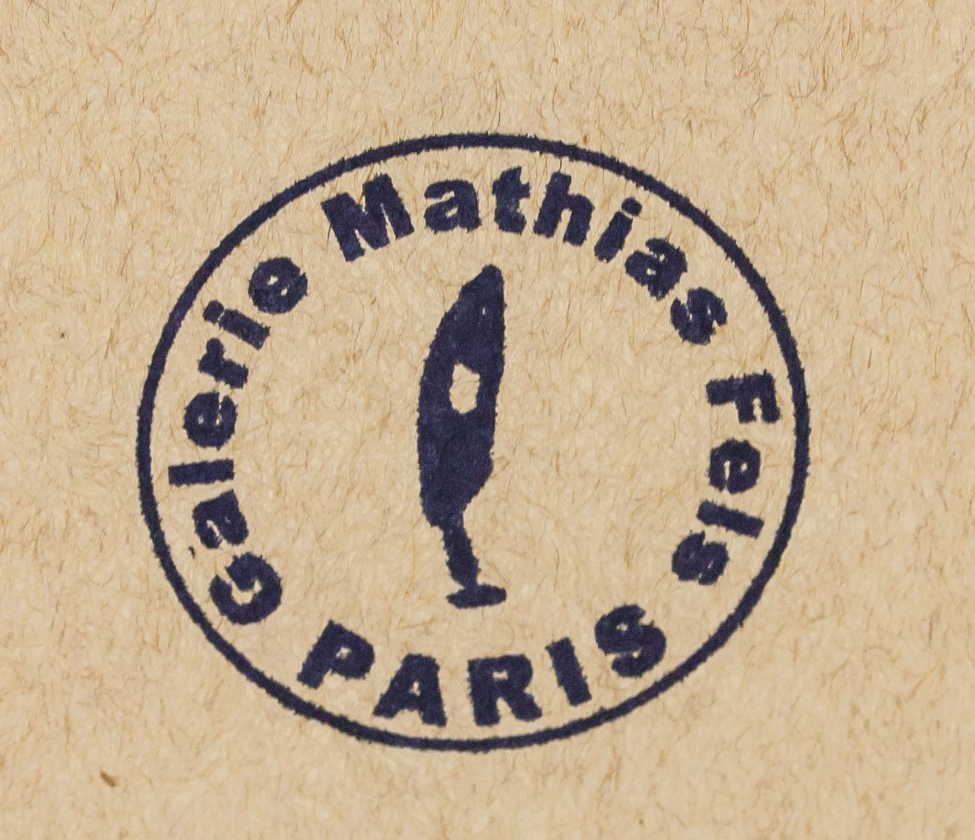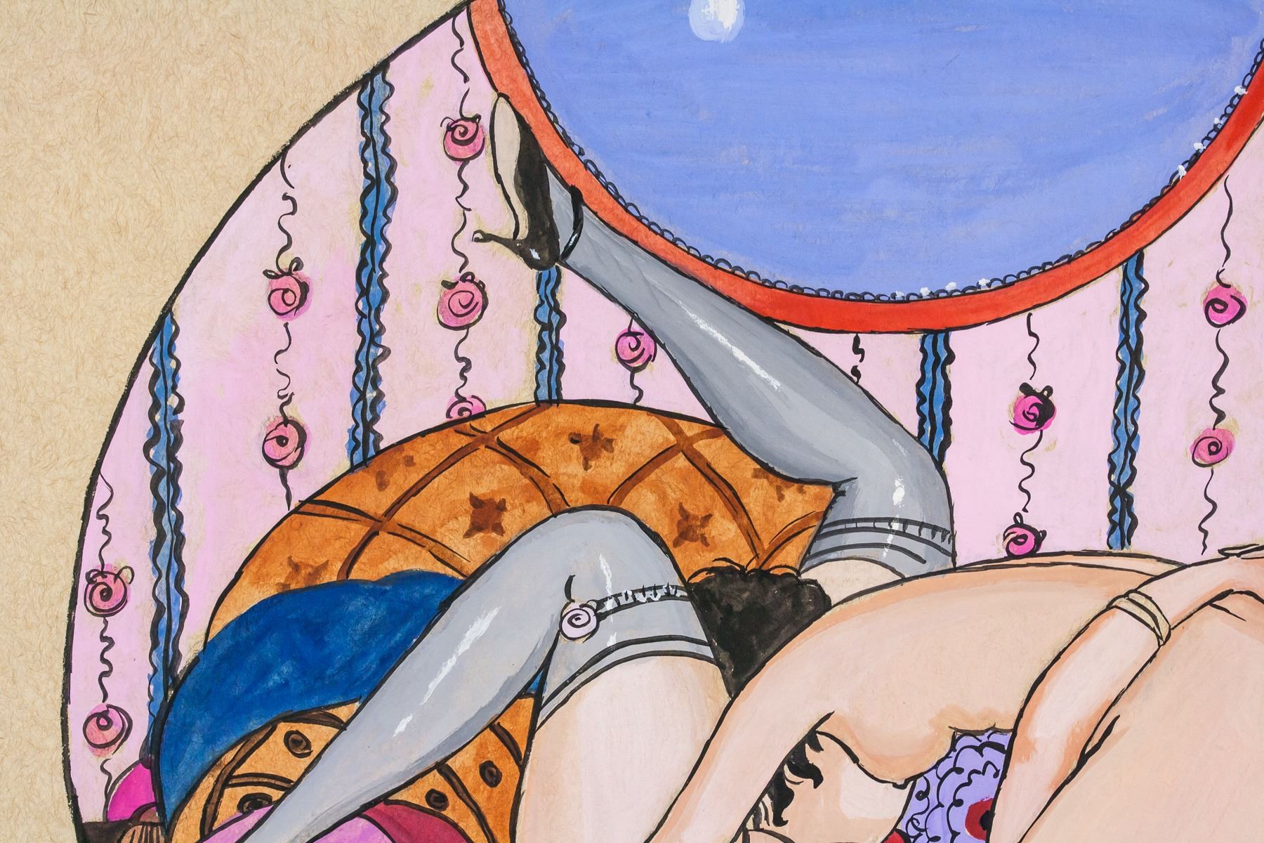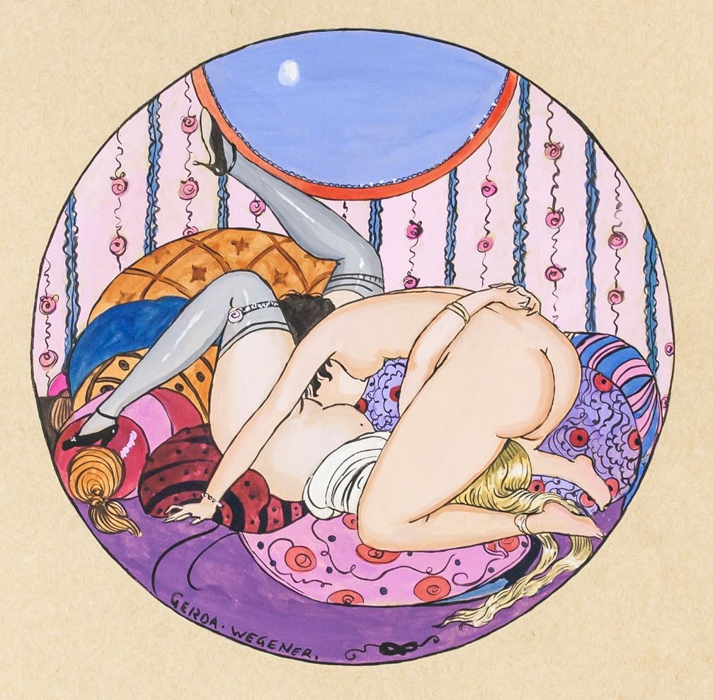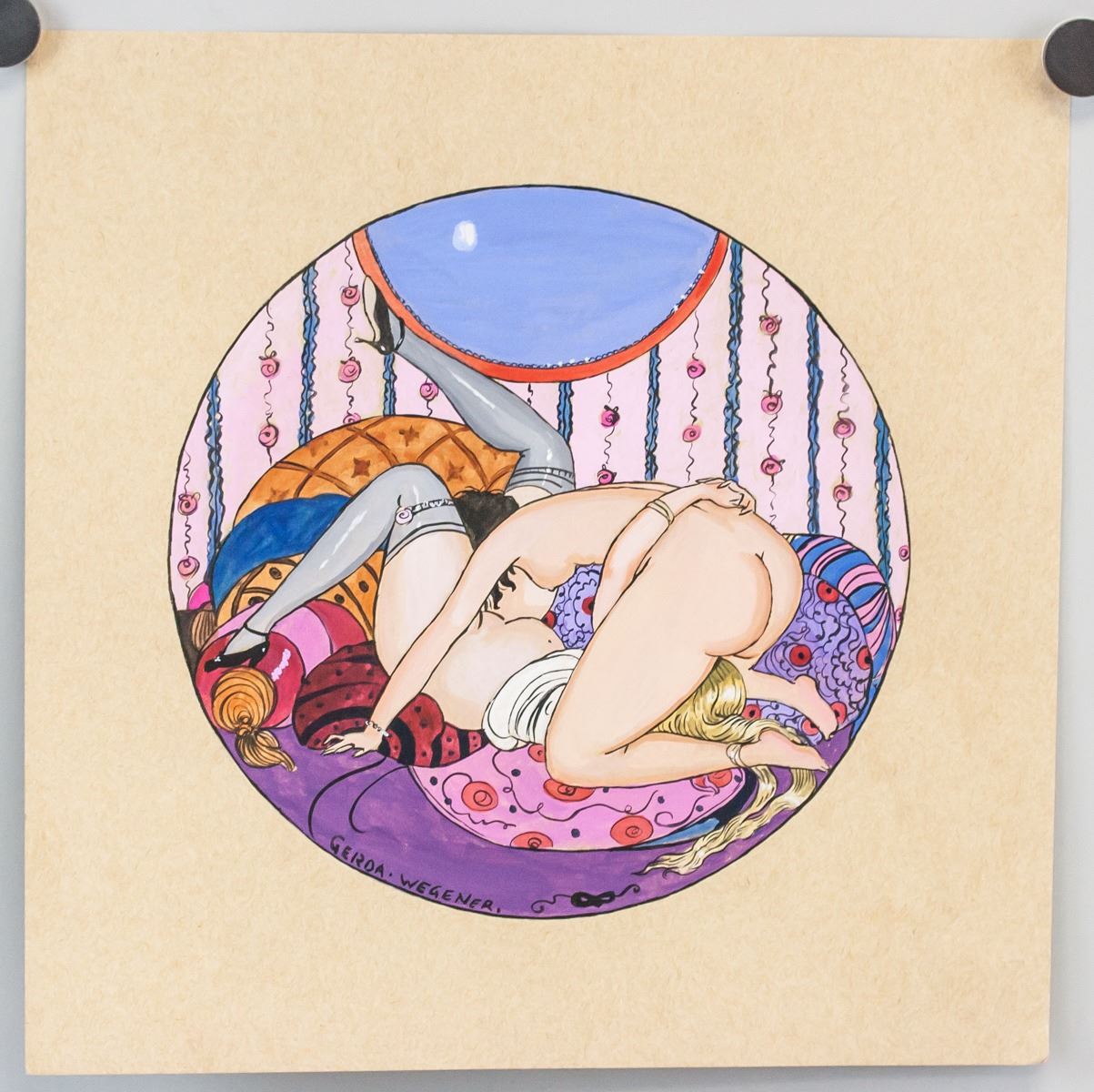 Gouache and ink on paper. Featuring amorous scene between two women. Signed "GERDA WEGENER" to the bottom center. Stamped on verso with "Galerie Beyeler Paris", "GALERIE LOUISE LEIRIS", and "Galerie Mathias Fels PARIS". Attributed to Gerda Wegener (1886-1940, Danish). 33 x 33 cm (13 x 13 inches).