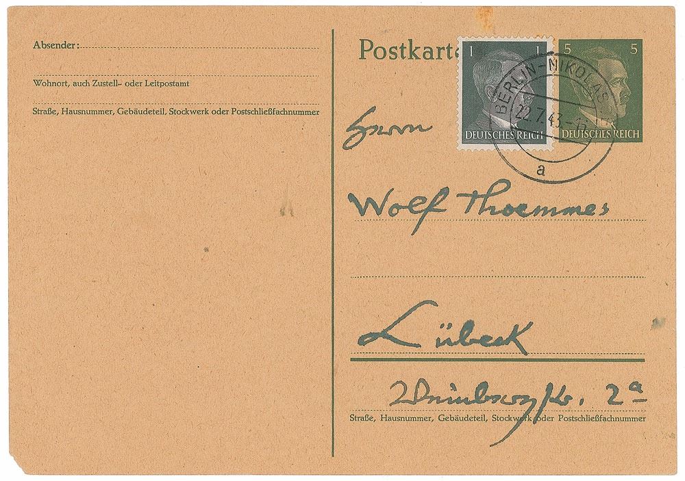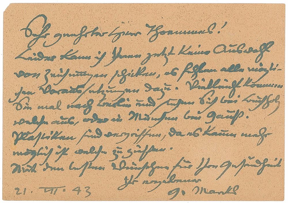 German artist (1889–1981) known primarily as a sculptor, who was one of the original faculty members at the Bauhaus. Untranslated ALS in German, signed “G. Marcks,” one page on a 5.75 x 4 postcard, July 21, 1943. Addressed on the reverse to Wolf Thoemmes. In fine condition, with one missing corner tip.