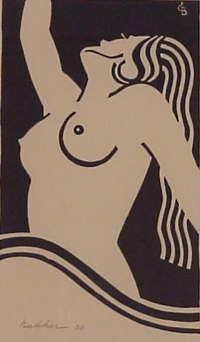 NUDE WOMAN, 1936, woodblock print, signed in pencil, sheet 11 ½ x 8”, framed with glass, soft creases. $100/200