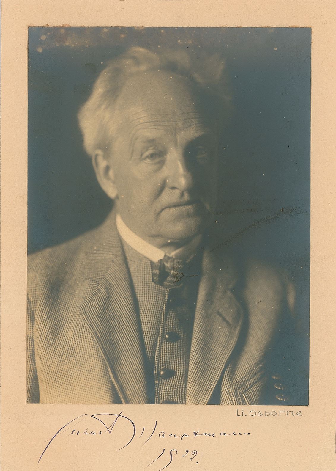 German dramatist (1862–1946) who won the 1912 Nobel Prize in Literature. Vintage matte-finish 6.25 x 8.25 portrait by Li Osborne, affixed to its original 7.5 x 10.5 mount, signed on the mount in fountain pen, "Gerhart Hauptmann, 1922." In very good to fine condition, with scattered speckled discoloration to the image.