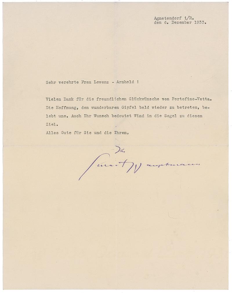 German dramatist (1862–1946) who won the 1912 Nobel Prize in Literature. TLS in German, one page, 9 x 11.5, December 6, 1933. Letter of thanks to Mrs. Lewenz-Arnhold in Berlin for congratulations he received. In part (translated): “Many thanks for your kind congratulations from Portofino-Vetta. I am hoping to climb this wonderful peak soon again. Also your wish means wind in the sails for this aim.” In fine condition, with central horizontal and vertical folds, one through a single letter of signature, and a few wrinkles. Accompanied by the original mailing envelope. RRAuction COA.