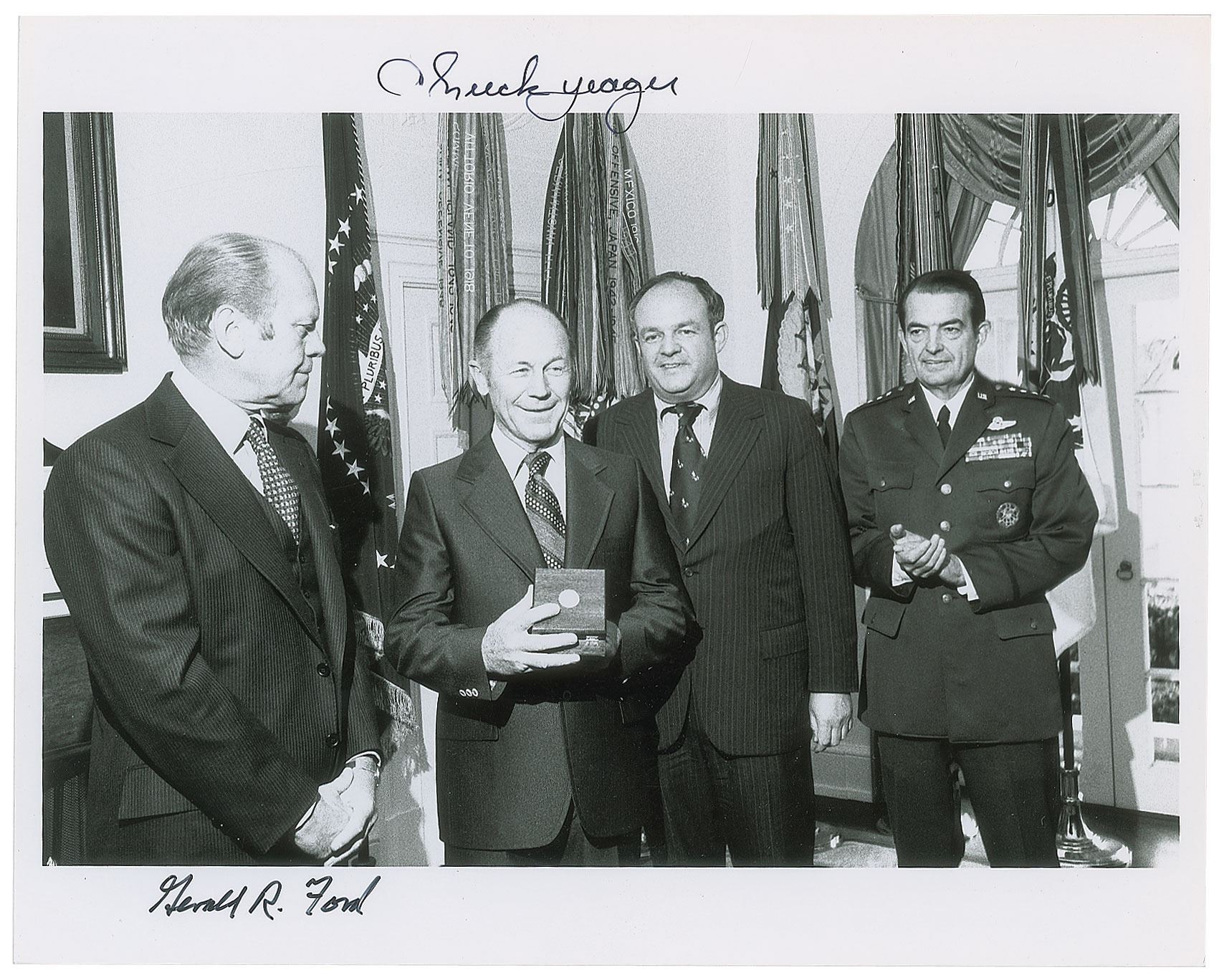 Glossy 10 x 8 photo of President Ford presenting Yeager with a special silver medal awarded by Congress, signed in black felt tip, "Gerald R. Ford" and "Chuck Yeager." Awarded by Congress, the medal was 'equivalent to a noncombat Medal of Honor…for contributing immeasurably to aerospace science by risking his life in piloting the X-1 research airplane faster than the speed of sound on October 14, 1947.' In fine condition.