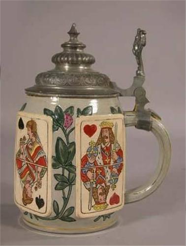 German 1/2 liter stein, 6 sided, playing card design. Manufacturer #1594 - 1930, no chips or cracks.