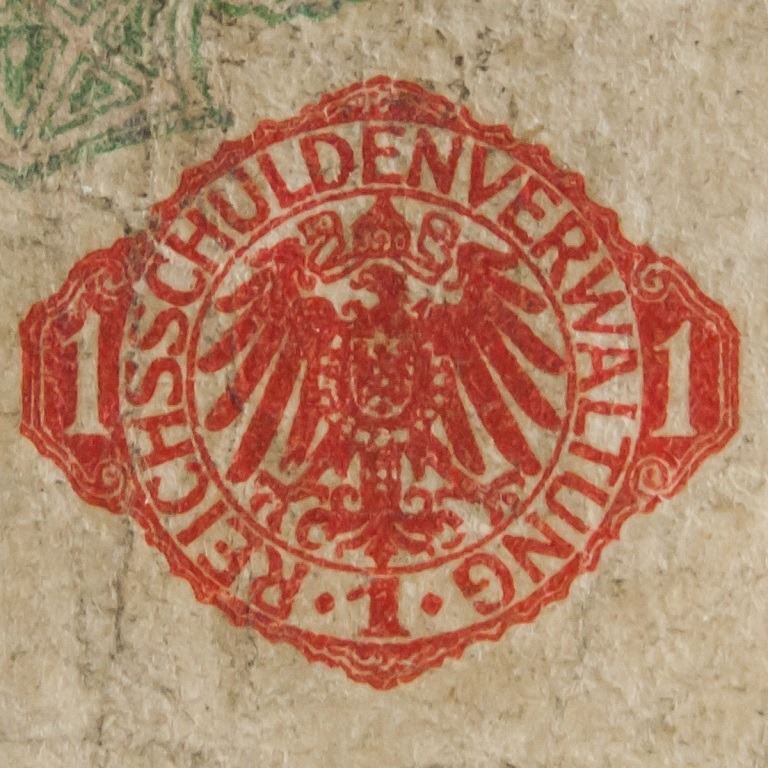 German paper money. Obverse: Text and ornament. Lettering: Darlehenskassenschein / Eine Mark / 1 Mark 1 Mark / Berlin, den 12. August 1914 / Reichsschuldenverwaltung / Wer Darlehenskassenscheine nachmacht oder verfälscht oder nachgemachte oder verfälschte sich verschafftund in Verkehr bringt, wird mit Zuchthaus nicht unter zwei Jahren bestraft. Reverse: Imperial eagle with crest shield. Lettering: 1 Darlehenskassenschein. 1 Mark 1 1 Mark 1 Eine Mark. 1.