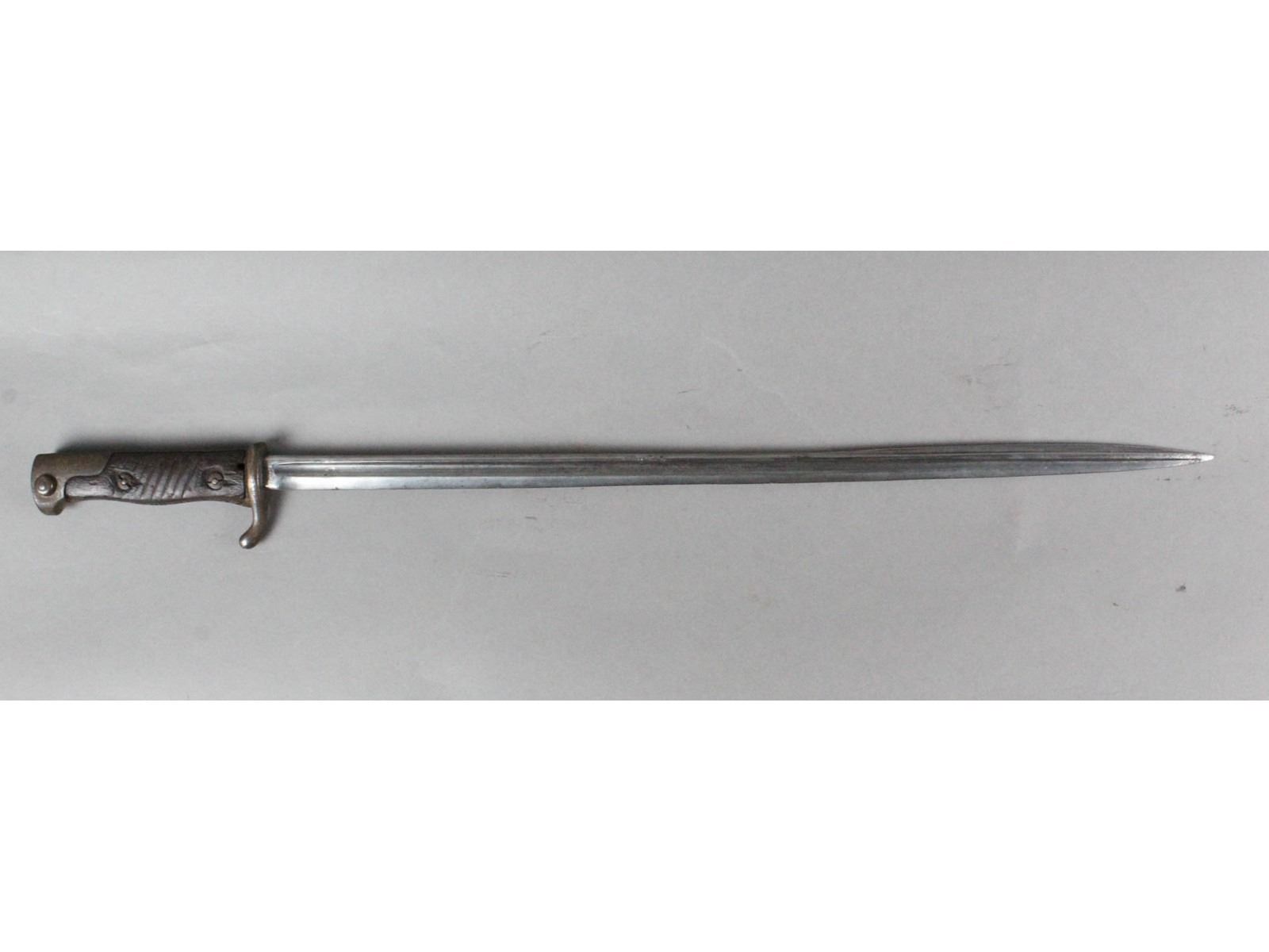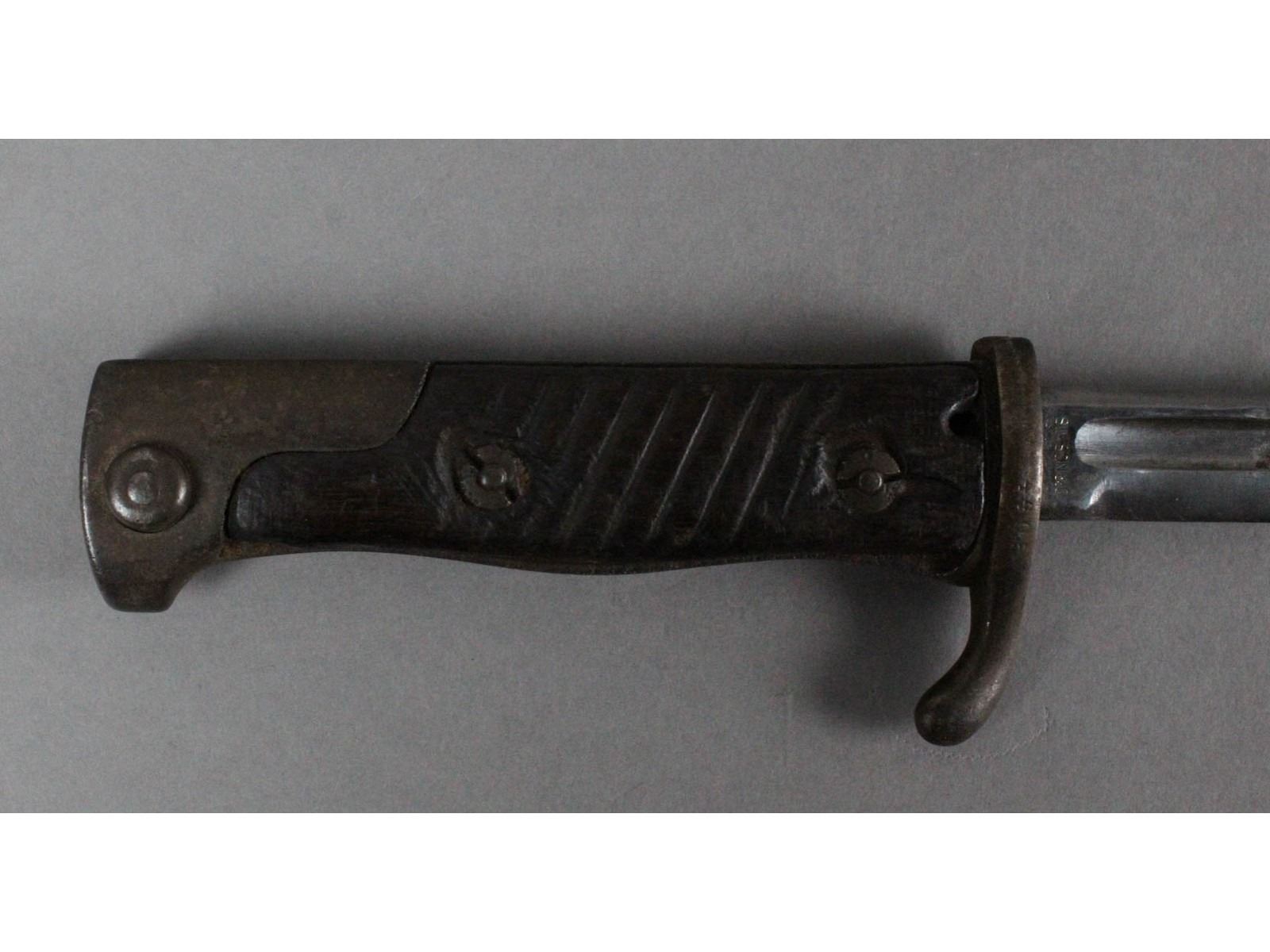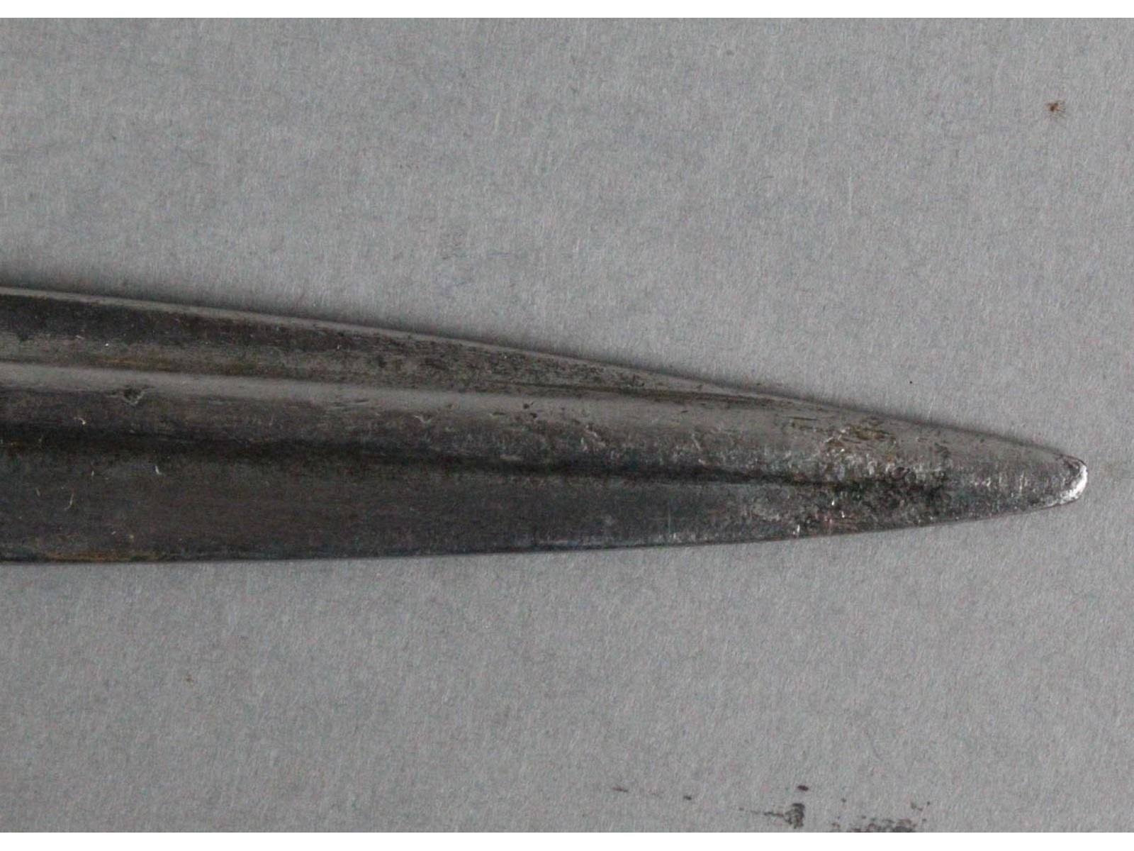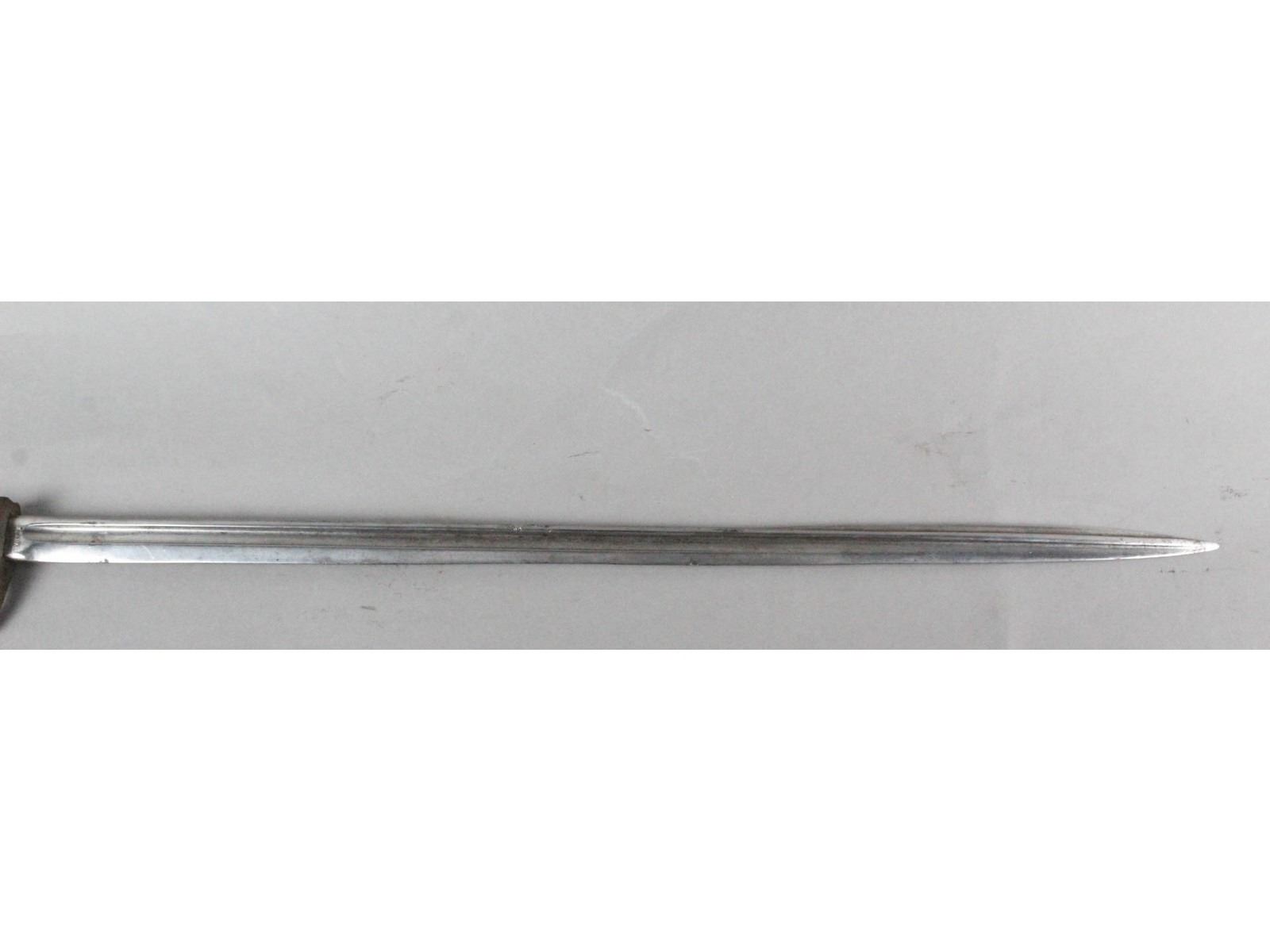 Blade measures 20.5", overall 25.75". No scabbard. Rib back blade shows average wear. Made by Simson & Co, Suhl. Date is worn off. Wood grips are heavily chipped. Pommel and crossguard show heavy wear and rust.