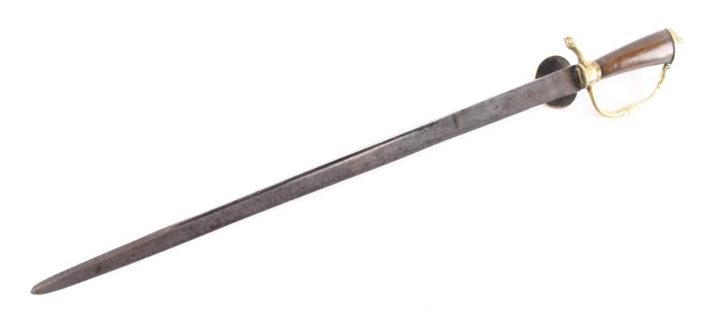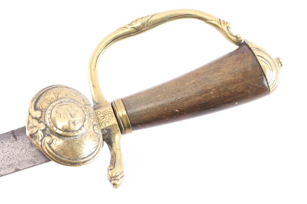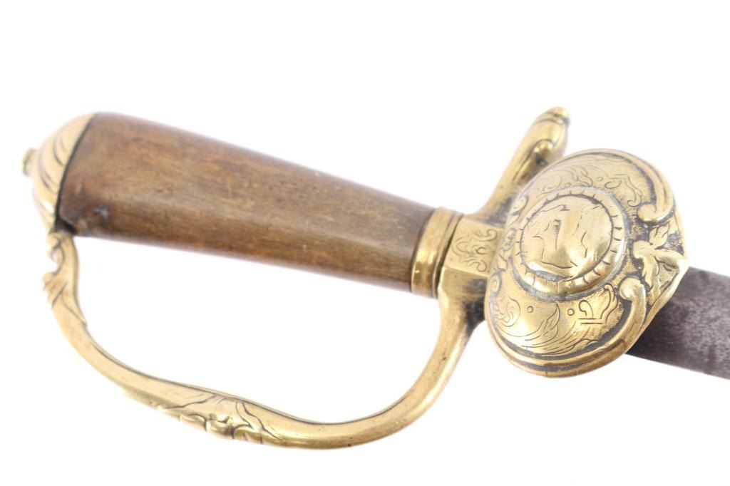 18th century German Hunting Sword, circa 1730. the 21 1/2" blade is worn with scattered light pitting, minor nicks, just traces of the blade etchings remain. Hard wood handle with brass pommel, guard with plate depicting a sitting stag, the raised circle is worn with just the outline of the stag.