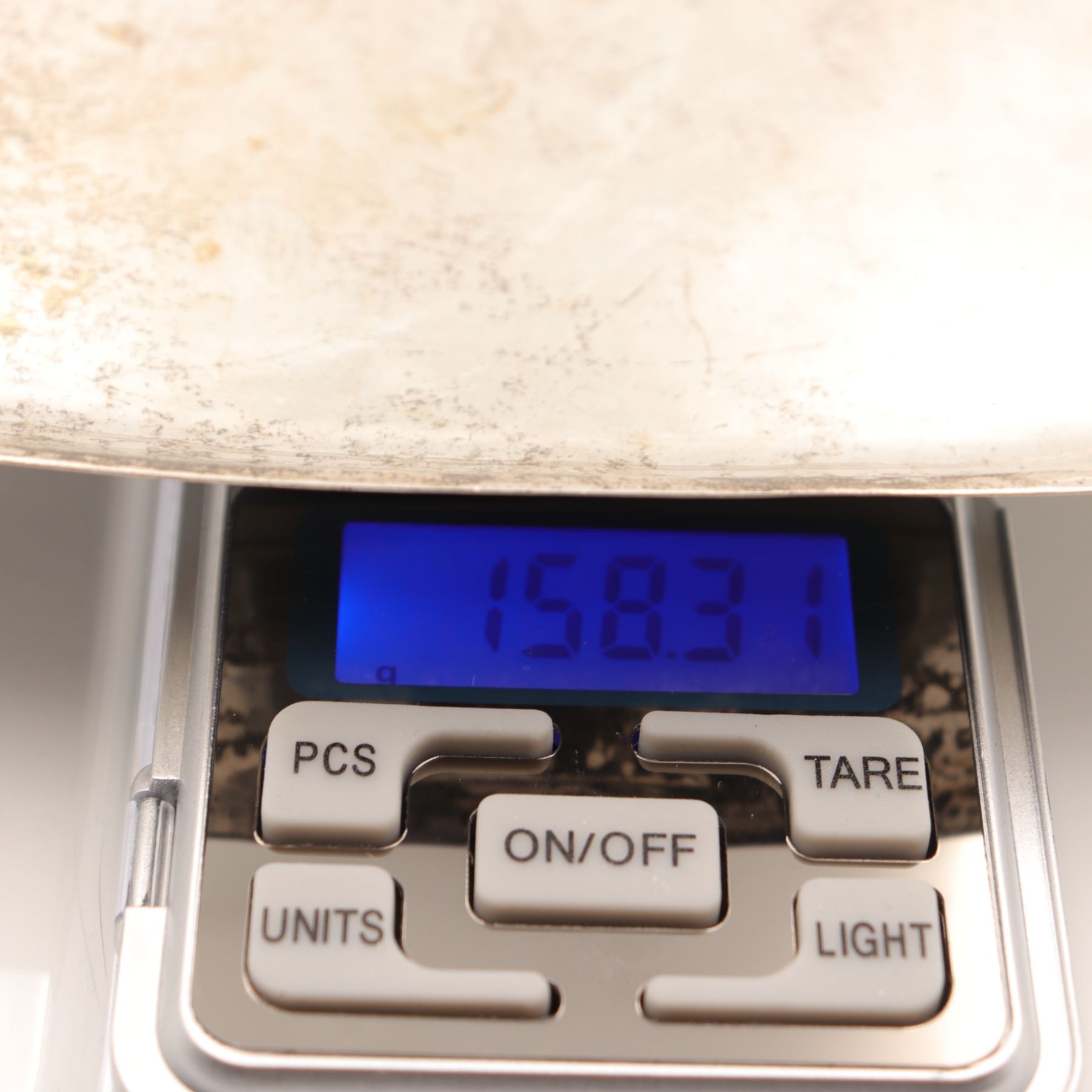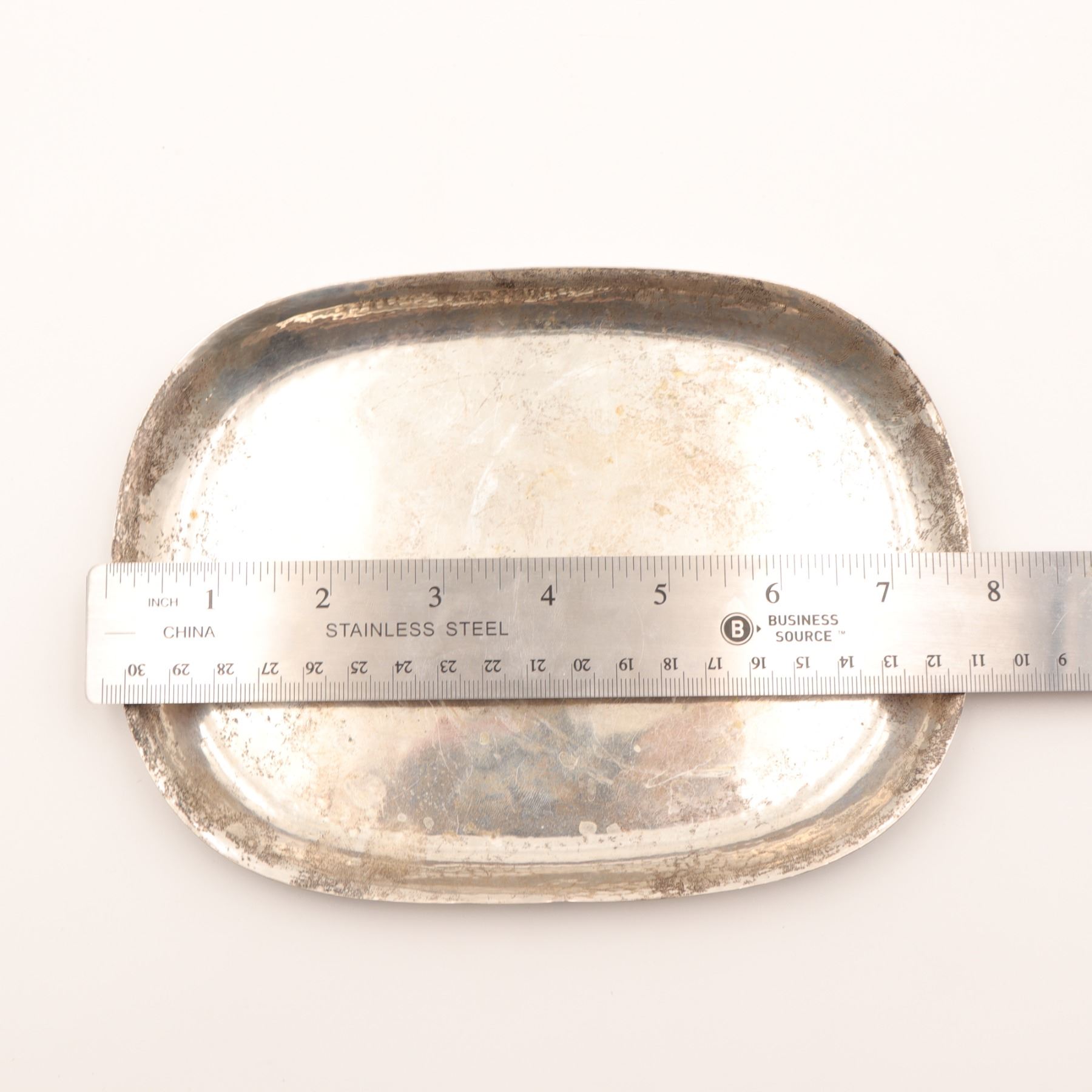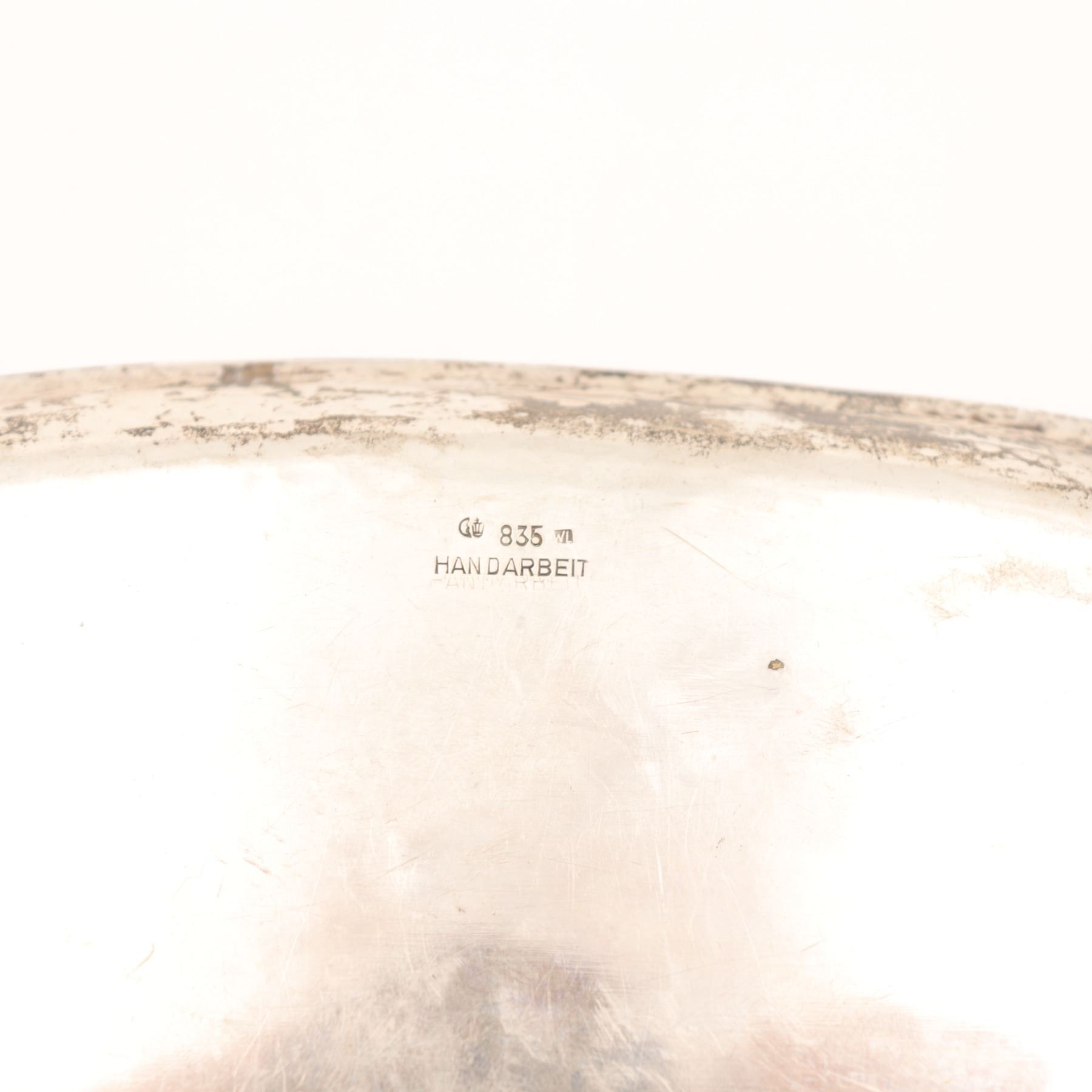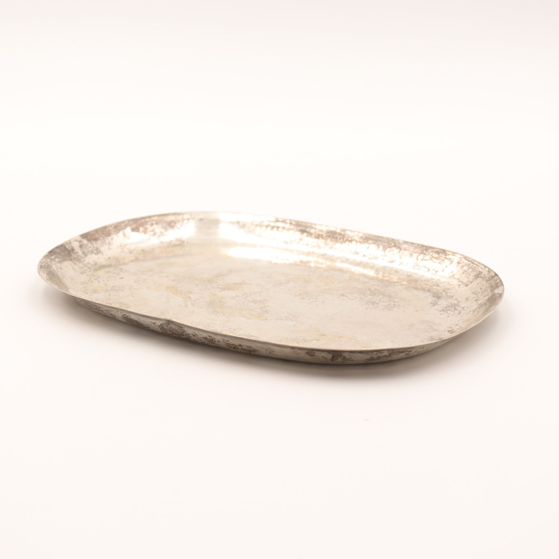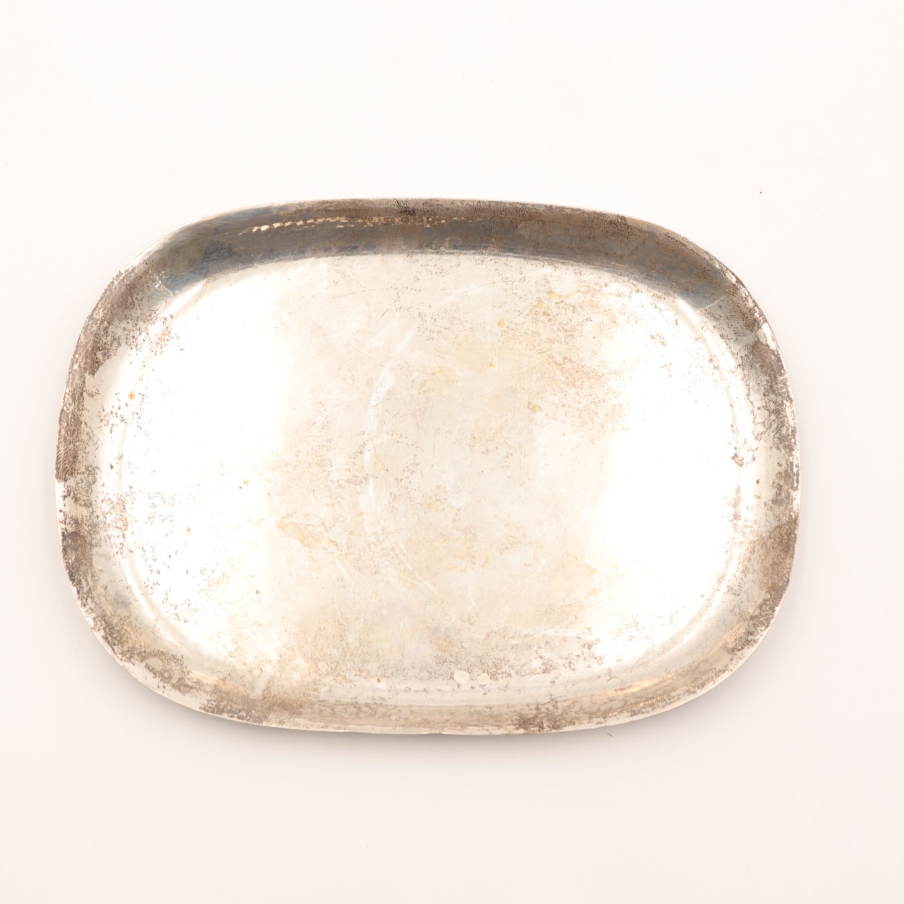 Small German 835 silver tray of rounded rectangular form with shallow well and gently raised rim, stamped 835 and HANDARBEIT. Plain, restrained design with hand-worked character, suitable as a vide-poche, calling card tray, or small desk accessory. 20th century. Presents with honest age and use, including overall tarnish, surface scratching, and patchy oxidation to the border and well.