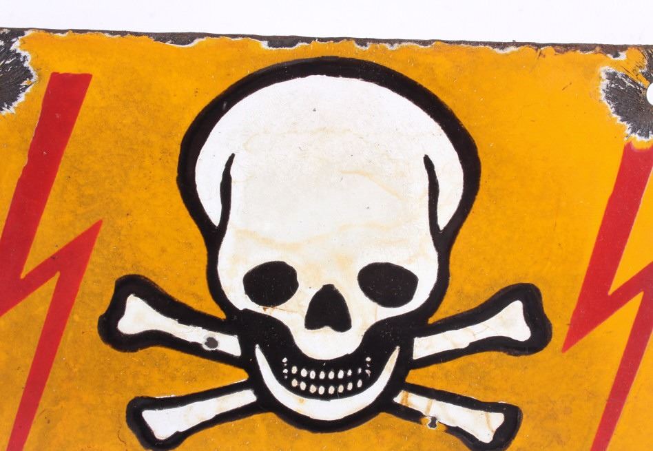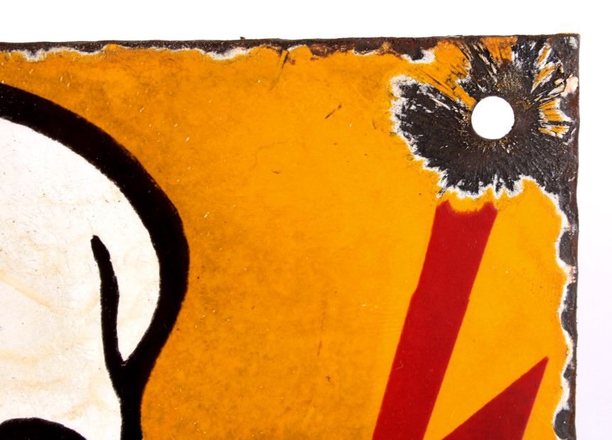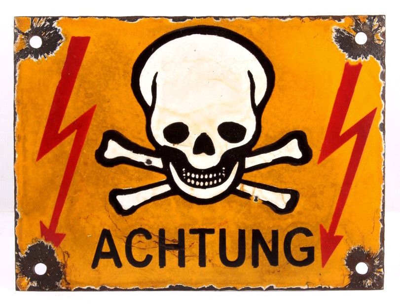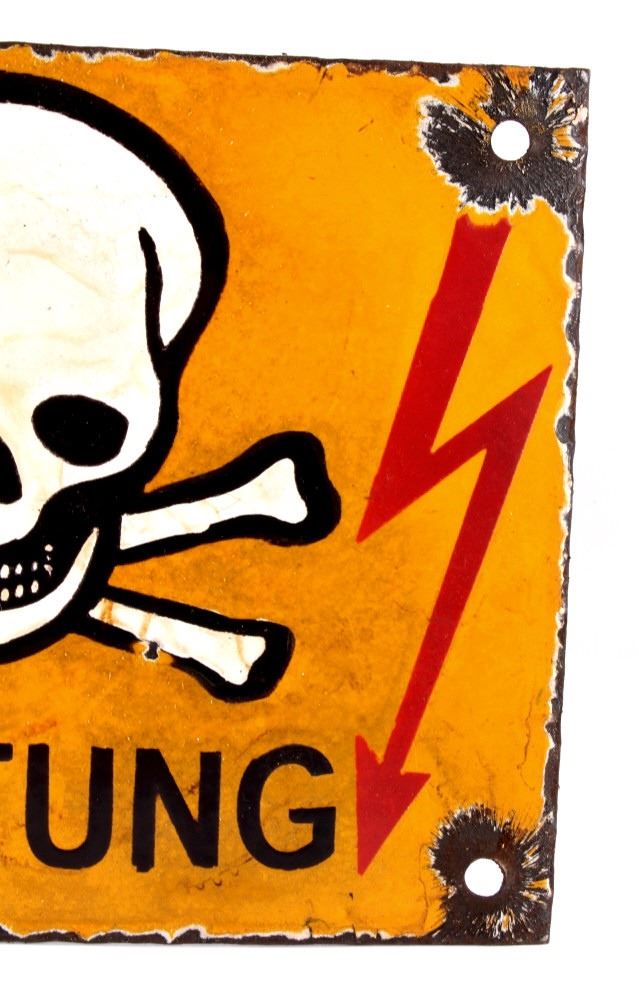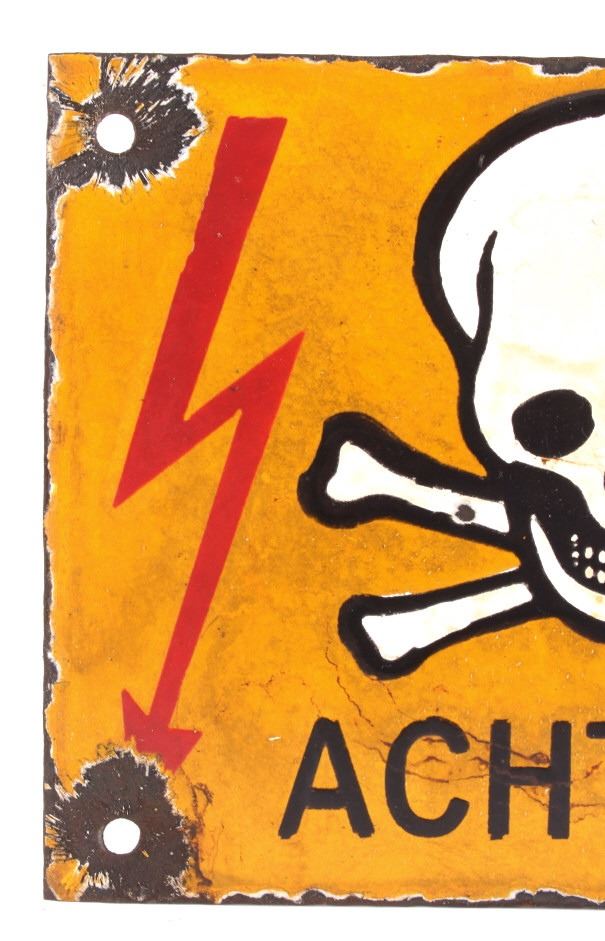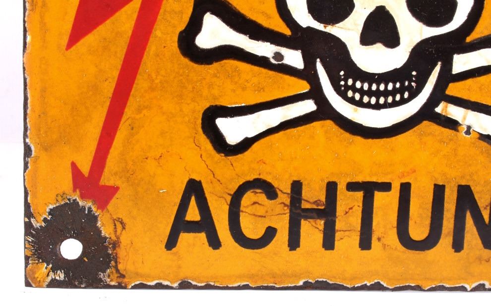 This is a porcelain enamel "Achtung" (meaning warning in German) sign showing a yellow/orange background with white and black skull and crossed bones with excellent red lighting bolts. The sign is believed to be a WWII Nazi piece as it was recovered with the other Nazi signs in the auction. These signs were recovered from war torn Poland from a private collection there. Measures 7 7/8"x6 1/8". RARE PIECE. Possibly a warning for mines or dangerous area.