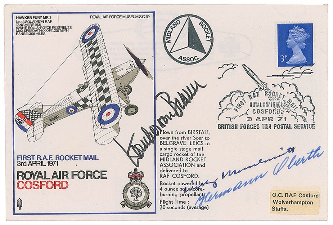Commemorative cover honoring the first R.A.F. rocket mail in 1971, signed in ink by Wernher von Braun, Willy Messerschmitt, and Hermann Oberth. In fine condition.