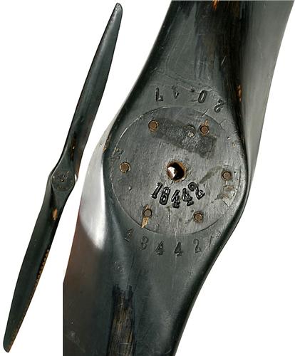 Deutscher Flugzeugpropeller, um 1930 Schwarz lackierter Zugpropeller, gemarkt 18442/80.17, Länge 212 cm, Holz mit Metallkante.