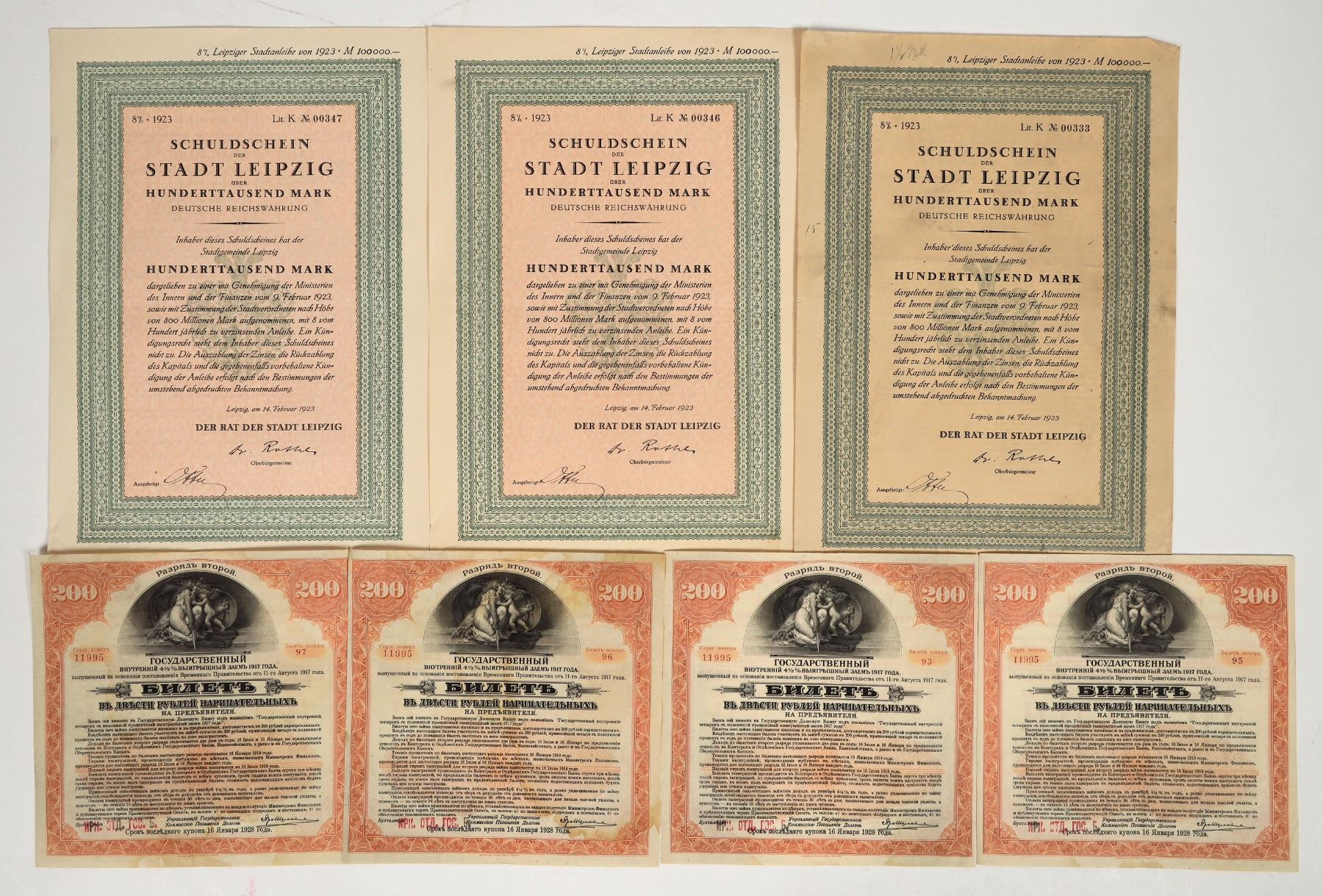 lot of 7. Three City Leipzig Germany $100,000 marks promissory not 1923. Trying to raise capital after WWI , Became worthless. Four 1917 Russian 200 Rubles winning loan ticket @ 4 1/2%. All in VG cond.