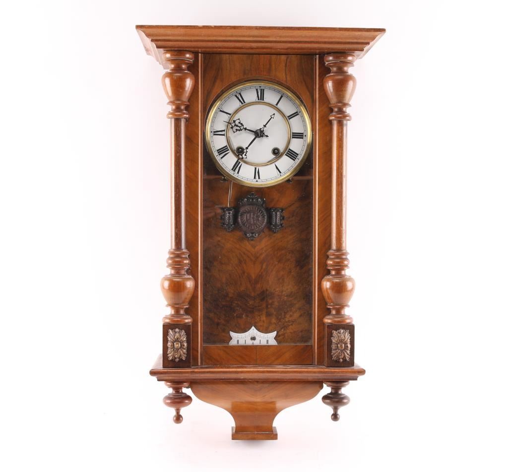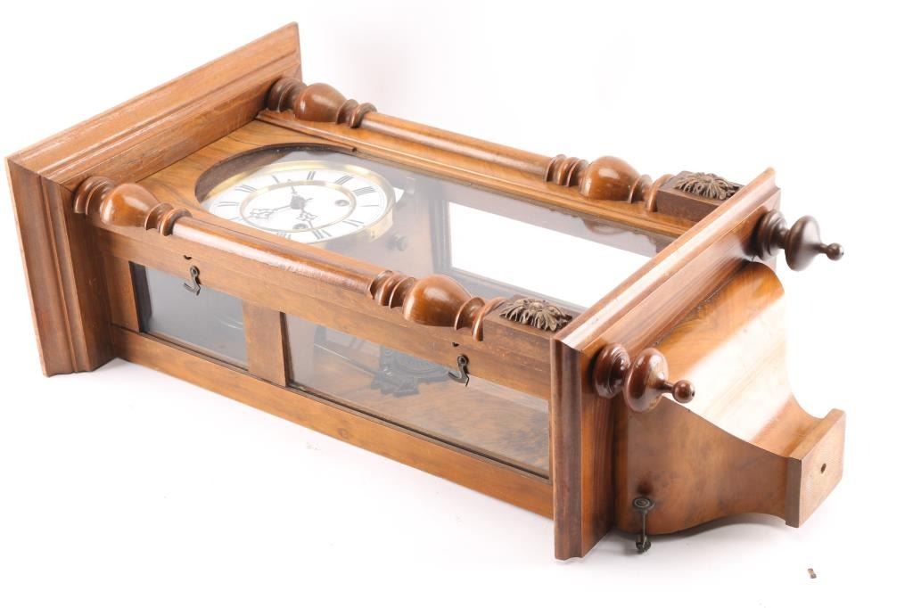 Fancy walnut case with lower finials. 25" x 13". In running condition. Local Pickup Only.